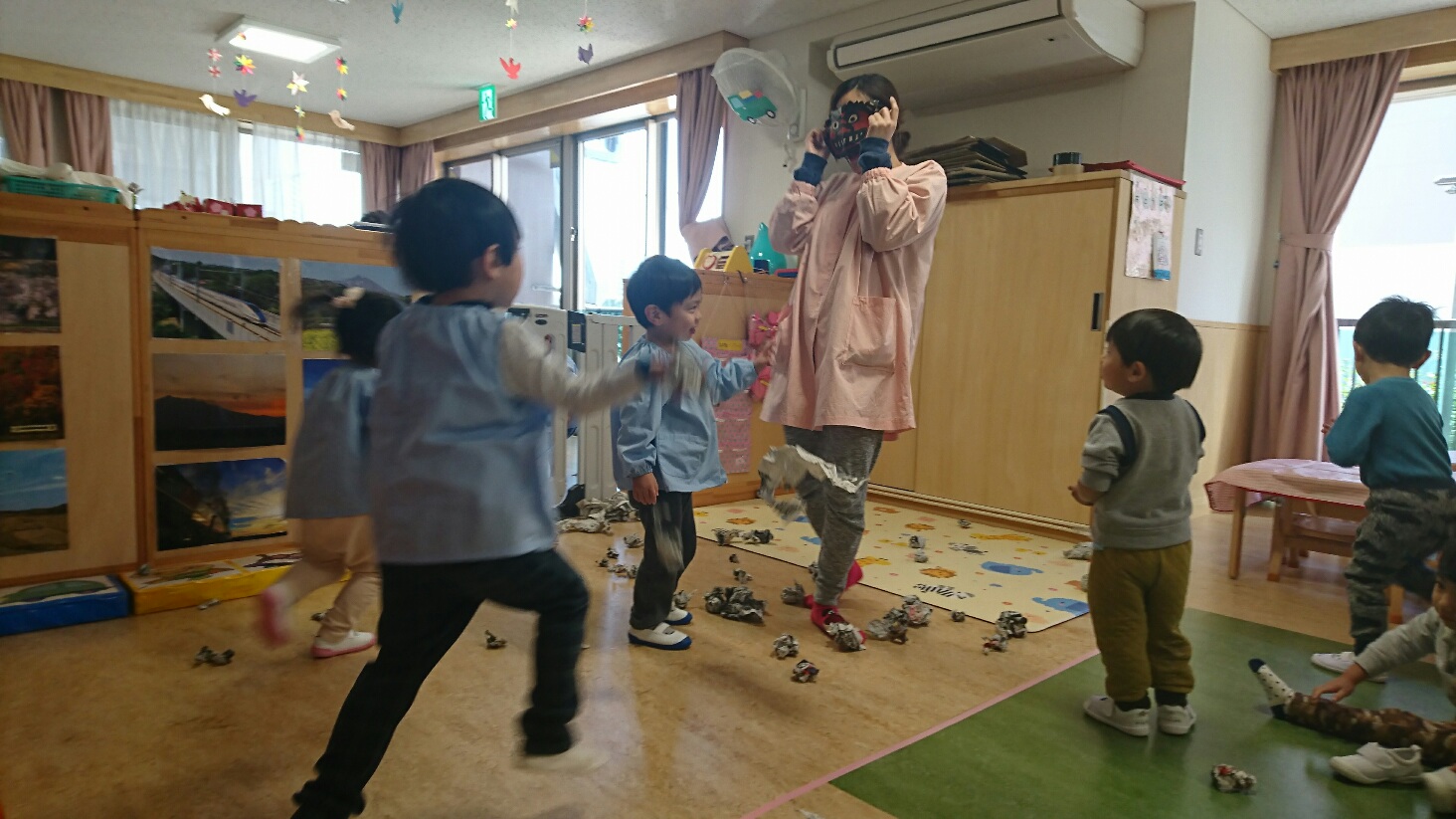 0.1歳児は先生が鬼に変身!最初はびっくりしていましたが、怖くないことがわかると『えい』と丸めた新聞紙を投げて遊んでいました。