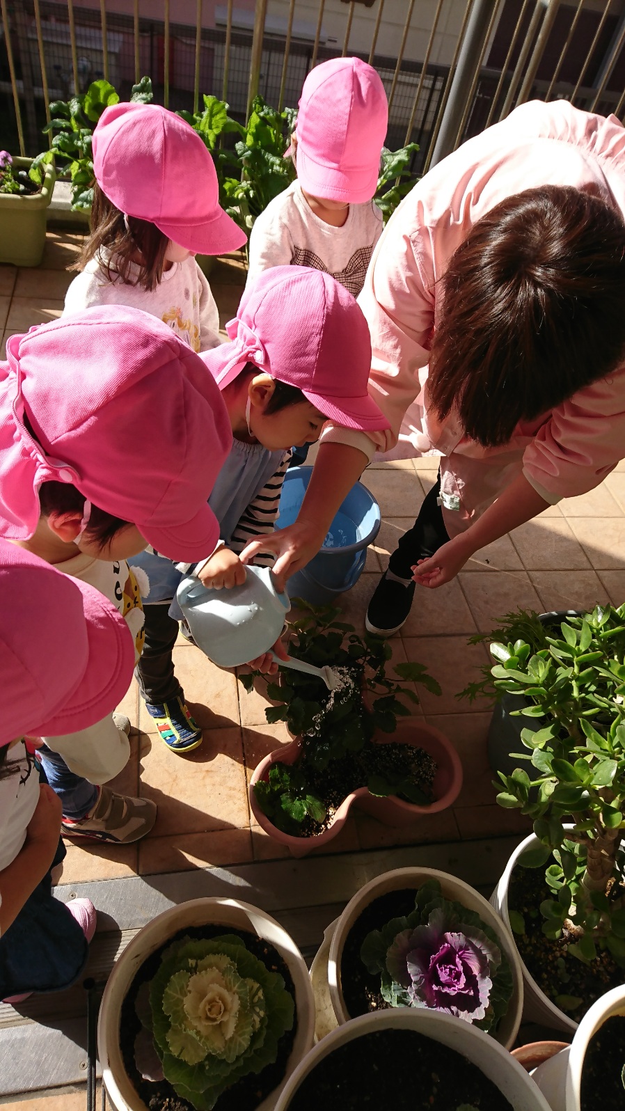 芽が出てくるかな? 11月16 栽培に興味を持っている2歳児クラスの子ども達。 パンジーや野菜に、お水をあげたり、先日蒔いたお花の種の成長を楽しみにしながら見る姿が見られています。 今日も野菜の種をみんなで蒔きました。 土を柔らかくして指で穴をあけて種を蒔きました。 『なんの野菜ができるかな?』 小さな種から芽が出る不思議さやお花の色の美しさに気づき『不思議だね~』『きれいだね~』と会話も広がっています。 これからも花や野菜のお世話を通して色々な発見をしていきたいと思います。