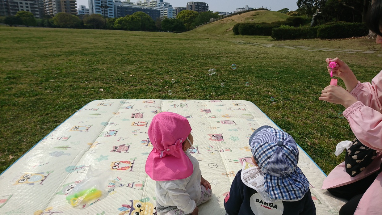 シャボン玉の不思議さに目をぱちぱちとしていた子や『すご~い』と追いかける子もいました。