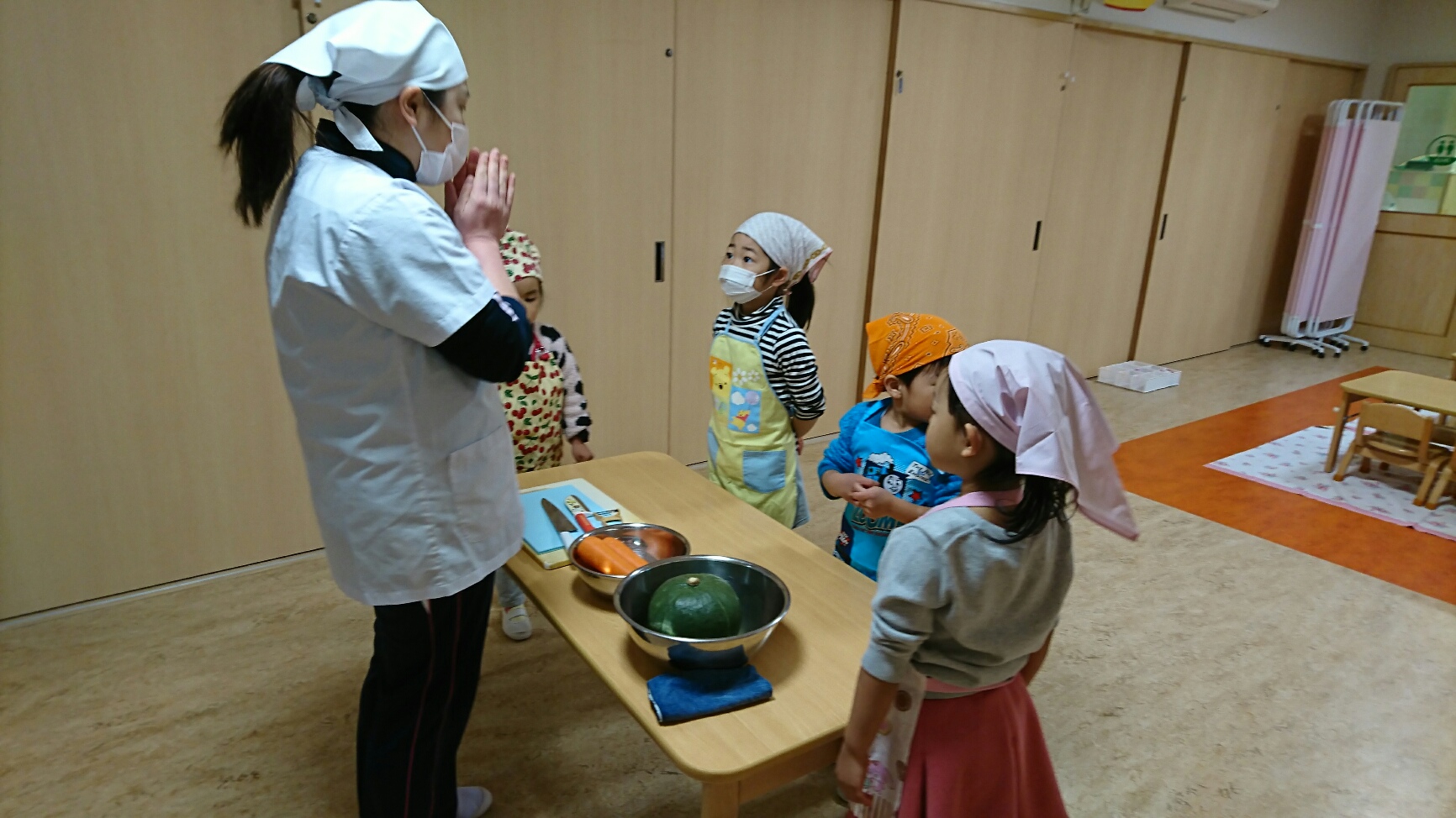 『早くエプロン付けたいね』『もう私は手を洗ったよ』準備をしてクッキング開始!!