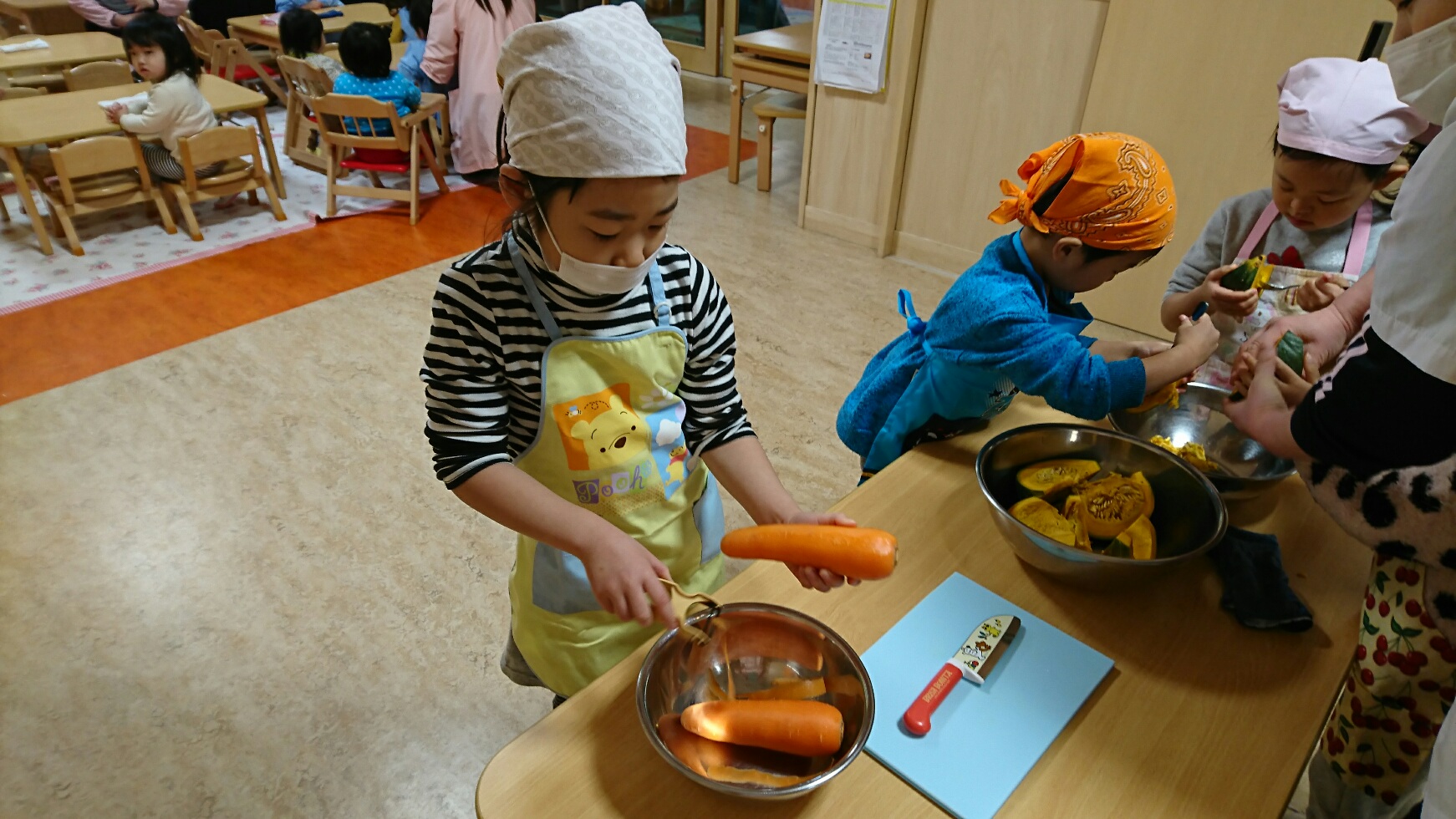 4.5歳児はピーラで皮をむいたり、包丁で材料を切ったりしました。