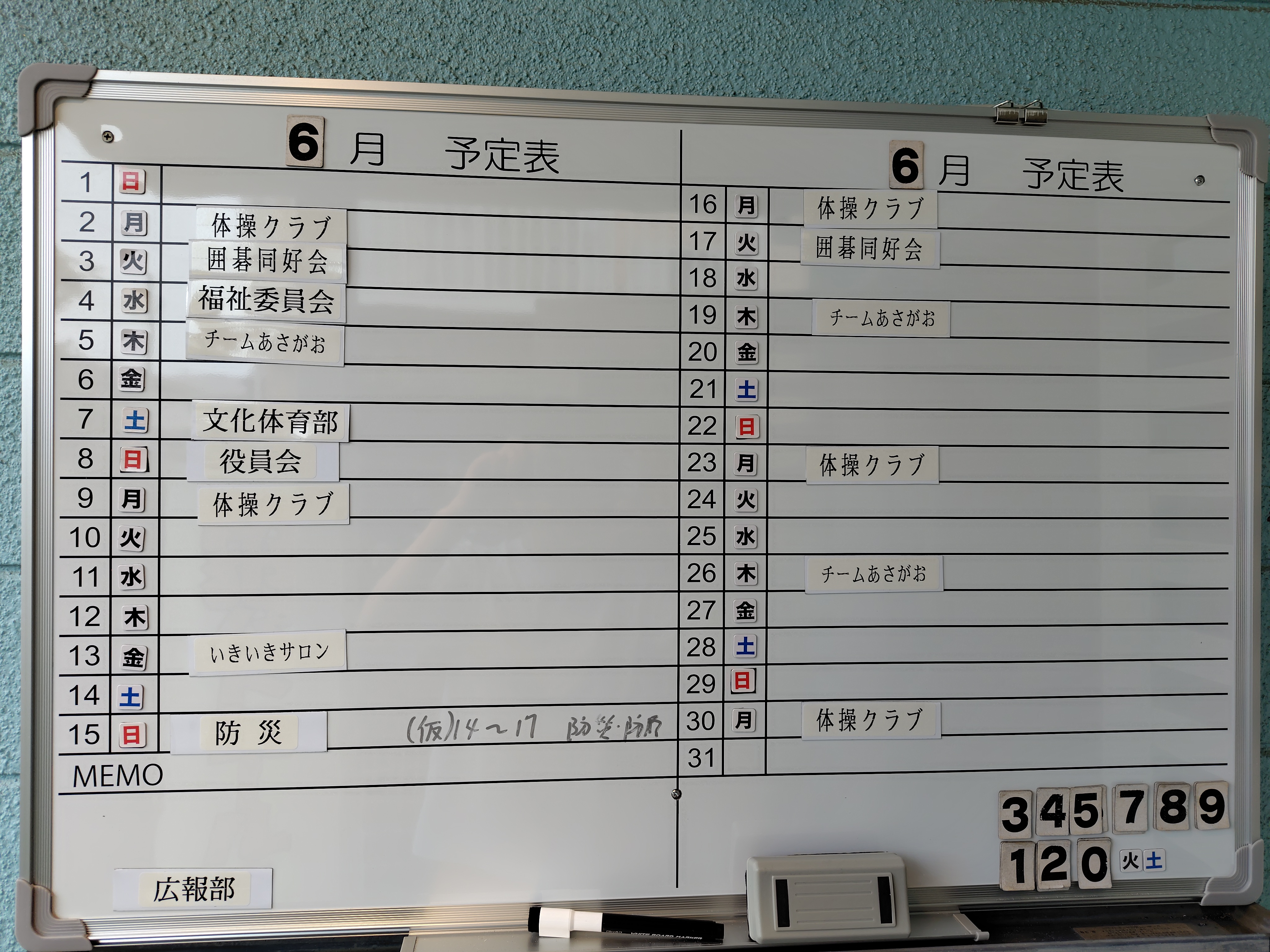 カレンダーボードの設置 6月10 集会所の入り口に新しいカレンダーボードが設置されました。集会所委員会の皆様ありがとうございます。 今後、役員及び集会所ご利用の同好会の皆さん、丁寧にご使用よろしくお願いいたします。 会長 H