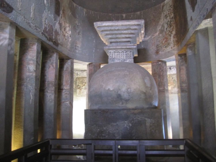 The Stupa in the Ajanta’s 9th cave was said to be sculptured in the 1st century AD. At this period of time, not Buddha statue but the Stupa was worshiped. It belongs to Theravāda Buddhism. Der Stupa in der 9. Höhle von Ajanta wurde gesagt, im 1. Jahrhundert n. Chr. gehackt worden sein. Um diese Zeit wurde nicht die Buddha-Statue sondern Stupa verehrt. Es gehört zu Theravāda-Buddhismus.