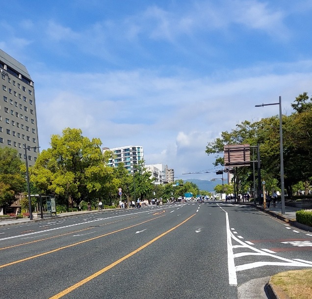 広島の市街地の中心部を、京橋川・鶴見橋から、太田川放水路・新己斐橋まで、東西に貫いているのは、平和大通りです。