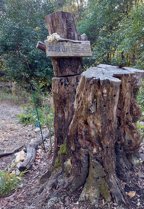山頂には、伐採した木の根に「耳成山山頂」と記した木札と、三角点の標石が、ありました。