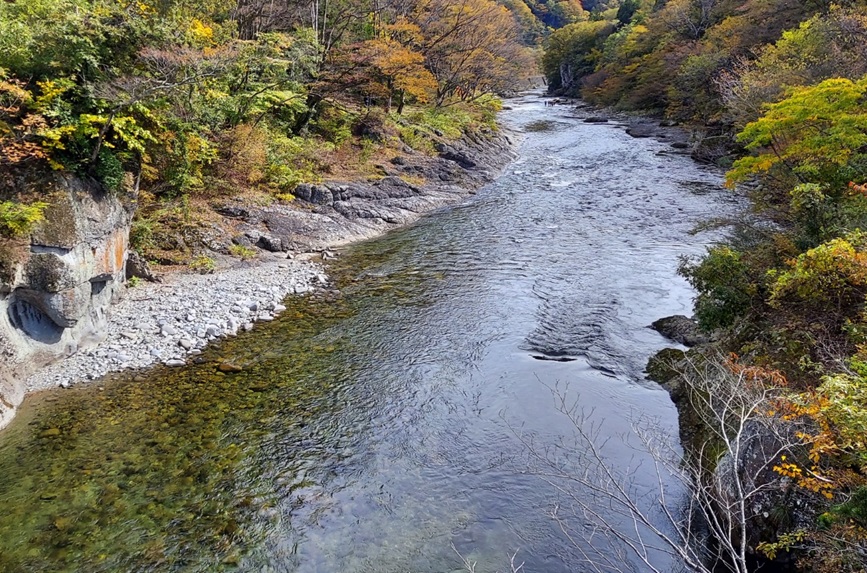 諏訪峡の上流側に紅葉橋が、下流側に諏訪峡大橋が、架かっています。