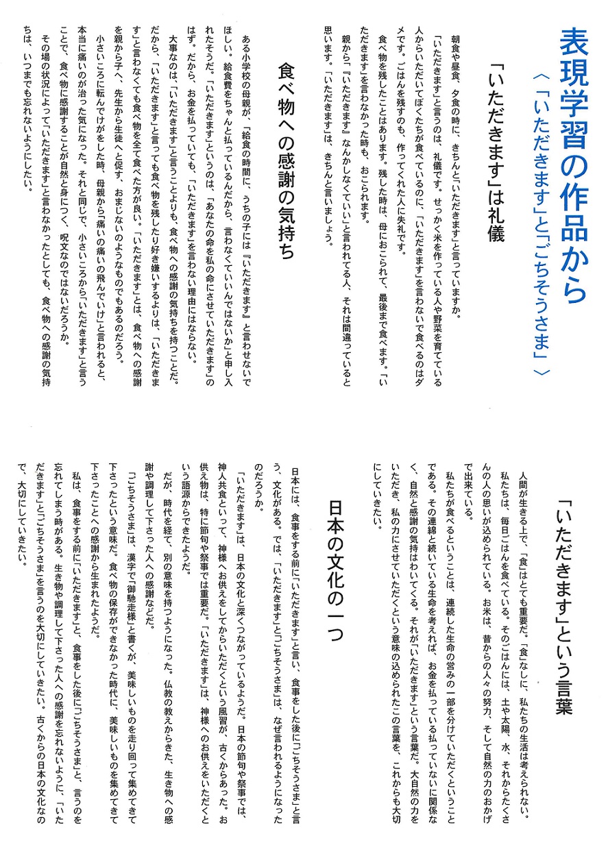 今回の表現学習は、食事の際に発する「いただきます」と「ごちそうさま」について、考えをまとめてもらいました。