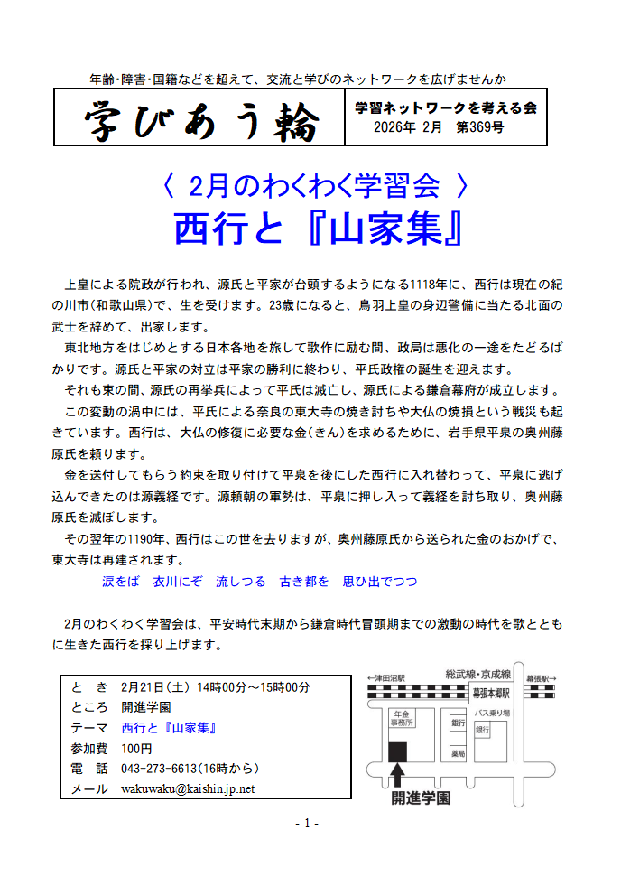 2月のわくわく学習会は、「西行と『山家集』」がテーマです。