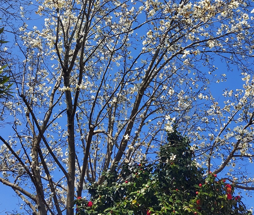 菜種梅雨の合間を縫って、コブシの花々が、青空に向かって勢い良く背伸びをしていました。