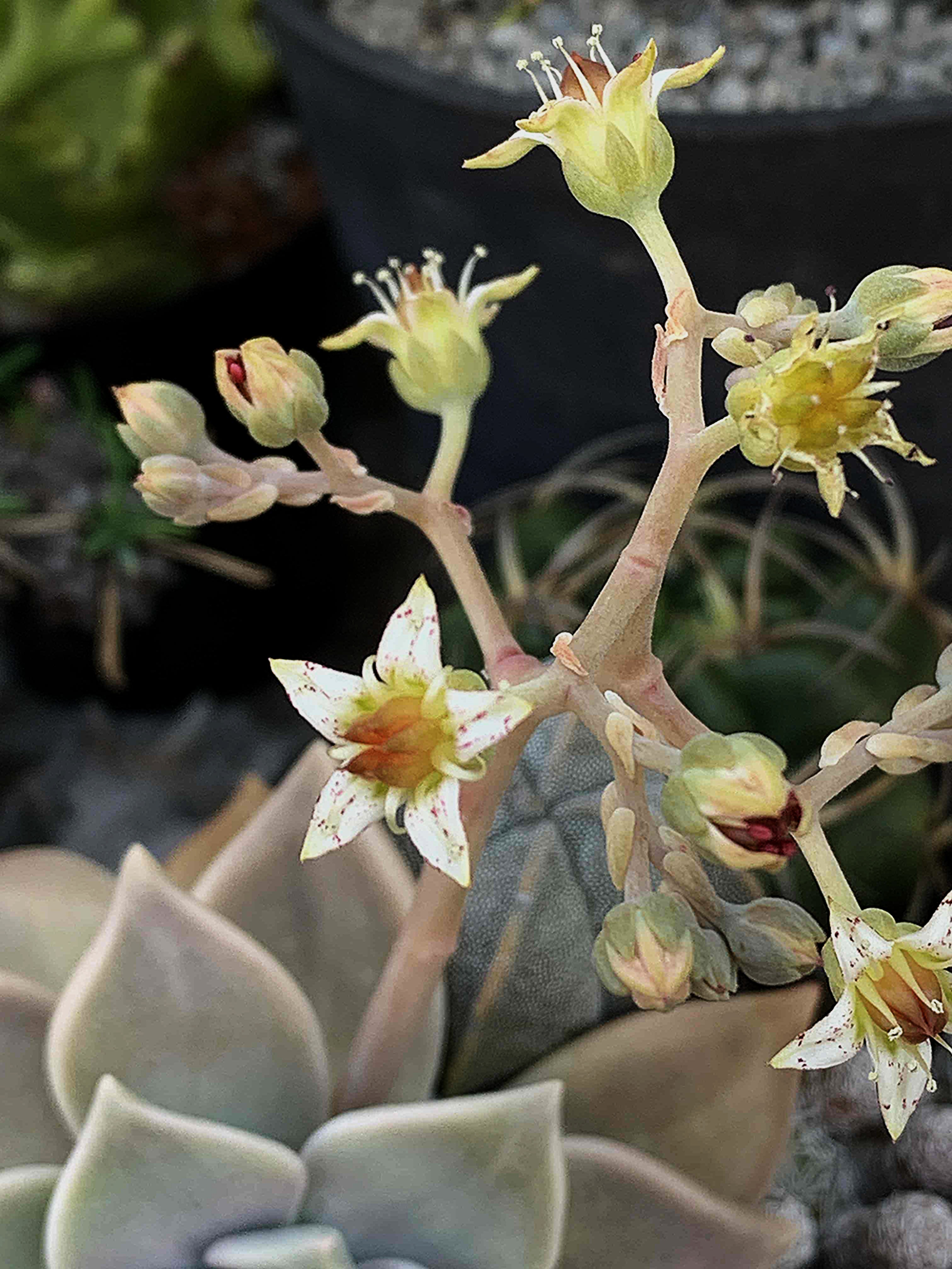 グラプトぺタルム 朧月の花 by オイッチニ · 2025年4月26日 丈夫で寒暖に強くて落ちた葉から発芽して 何もしなくても増え続けるおぼろ月ですが 花を咲かせています。 アップしてみると結構きれいな花です。 後ろの峨眉山も丈夫で毎年元気です。 12年前の記事はこちら 峨眉山