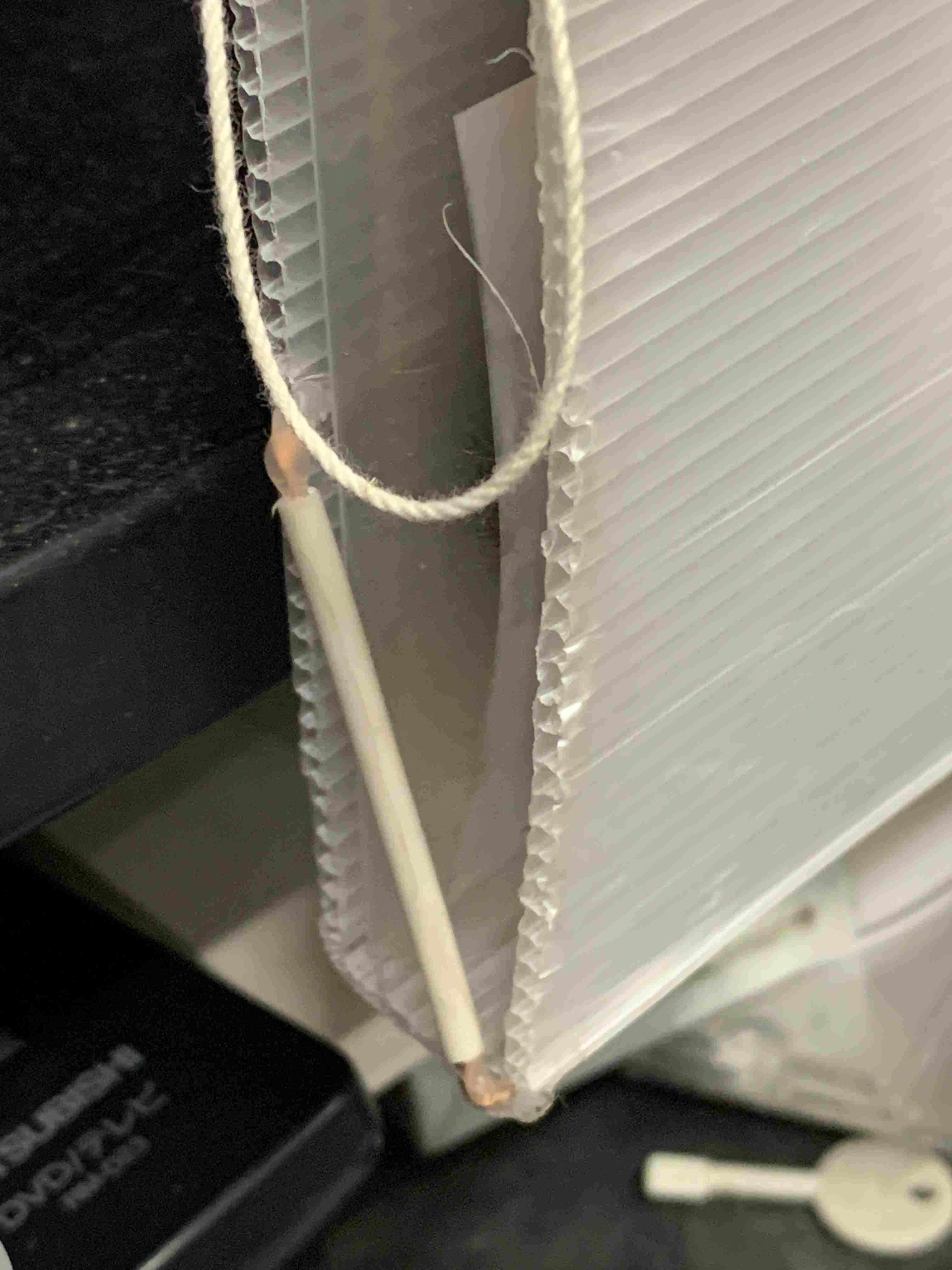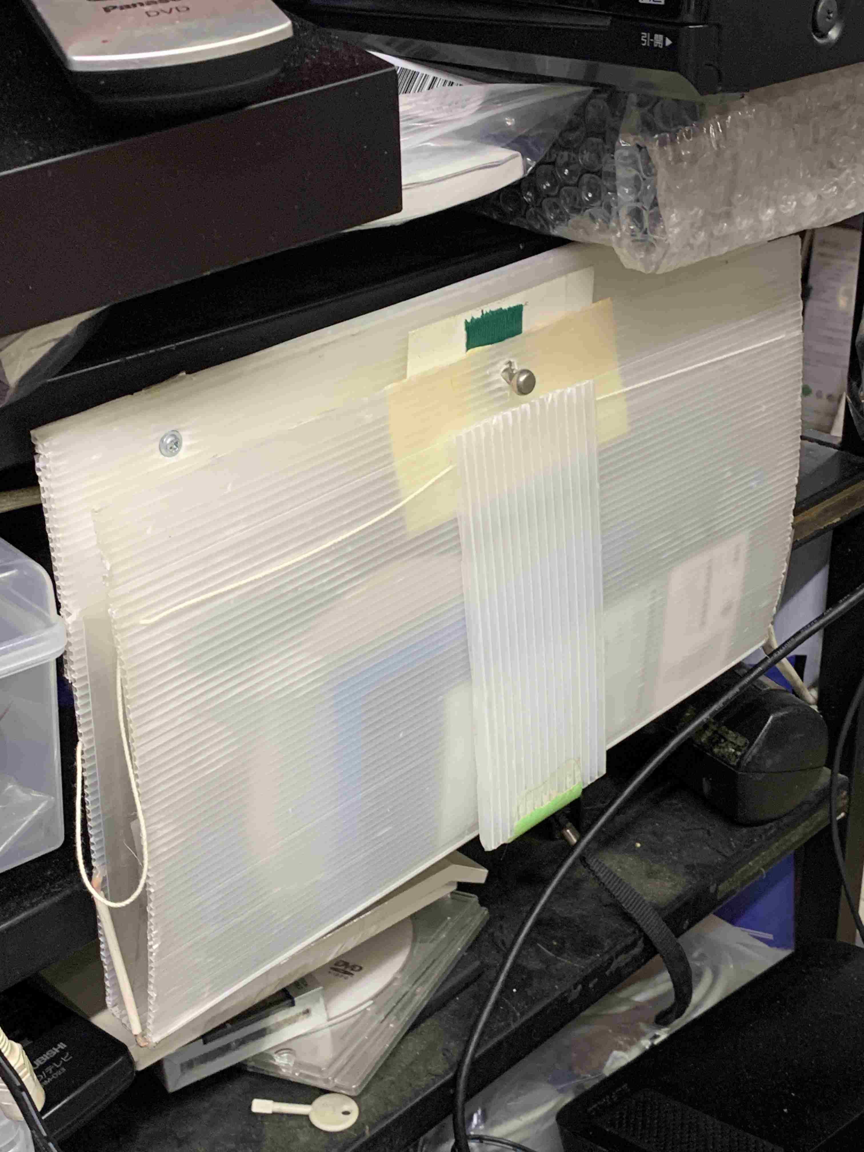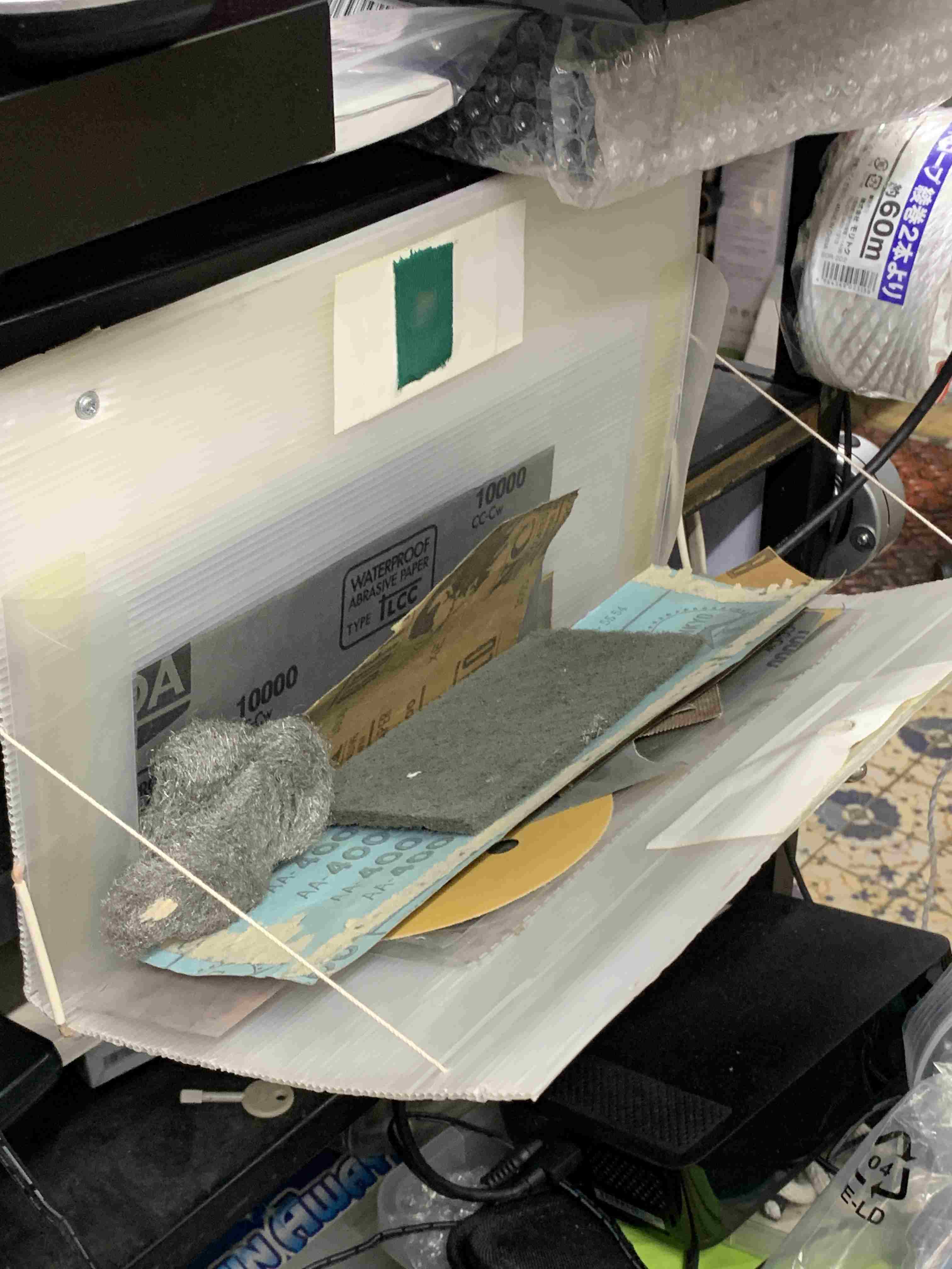 プラダンでサンドペーパーの簡易置き場 by オイッチニ · 2026年3月2日 サンドペーパー等を使うたびに収納場所から 取り出して切って、使い終わったらもとに 収納するのが面倒なのでこんな物を作って 便利に使ってます。 収納時はこのようにコンパクトになります。 マグネットで使用頻度の少ないスチール棚に 貼り付けて、棚を使う時は簡単に取り外せます。 収納量を増やす目的で下部に2cmほどの 底辺を作るためにFケーブルの芯線でコの字 型を作って差し込んであります。 凧糸は開く角度を決める為に付けています。