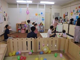 今回は、お部屋全体を使って風船遊びです!ここは小さな風船をたくさん用意しボールプールのようなコーナーにしました。扇風機やうちわの風に乗ってカラフルな風船が舞い上がると、「キャー♡」とお友達も追いかけてとても楽しそうでした。