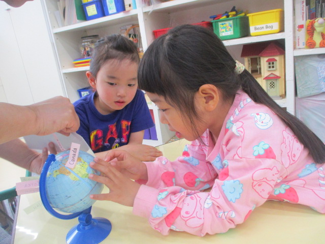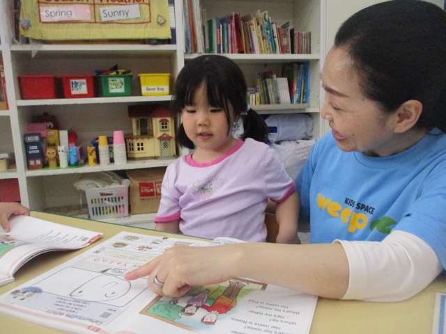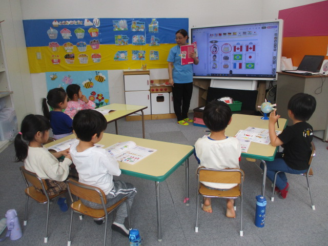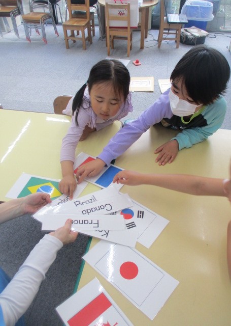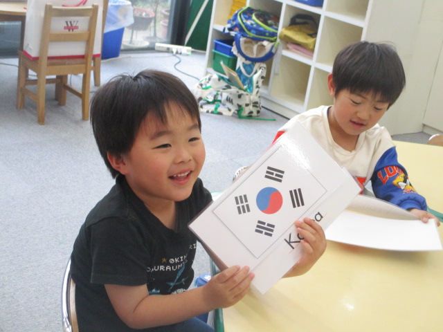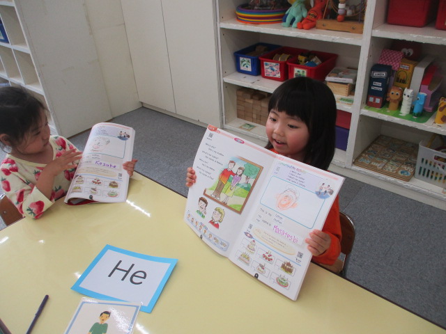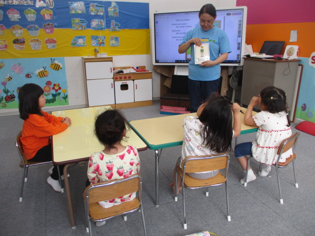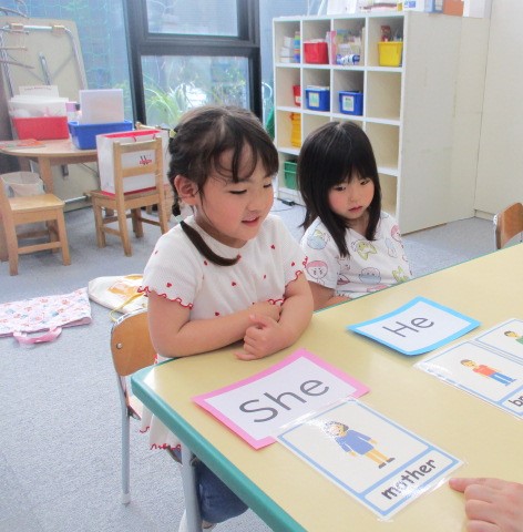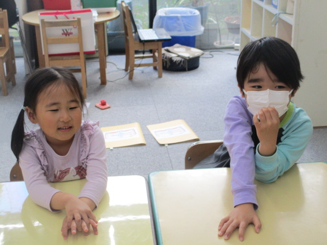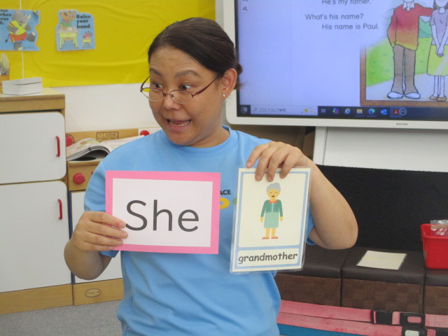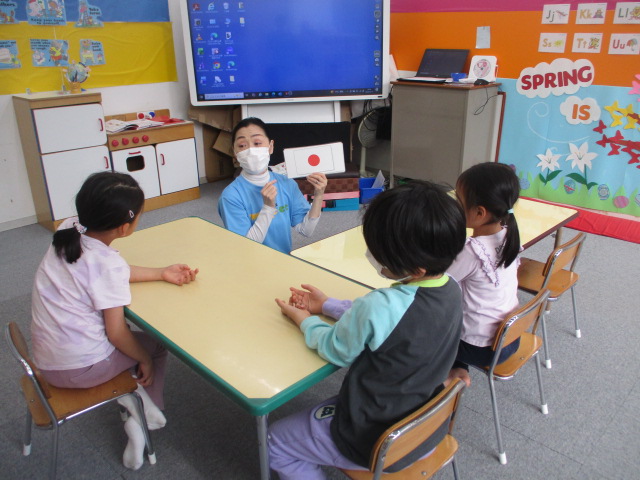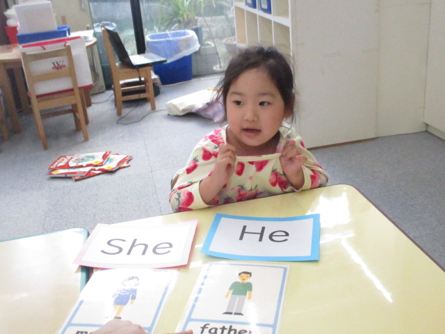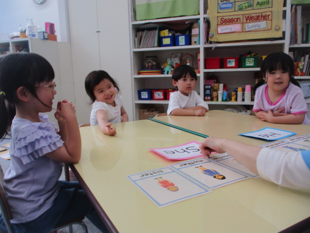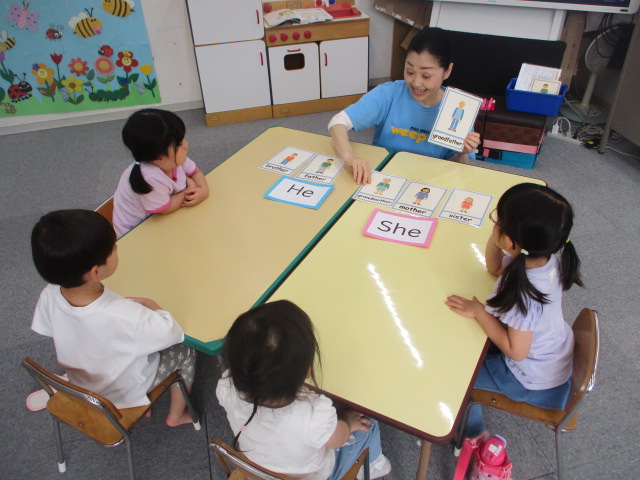 「family」の絵カードを使いながら先生が「Who’s he?」や「Who’s she?」と質問をすると、「He is my father.」「She is my mother.」のように「私のお父さん」「私のお母さん」と答える練習をしました。「おばあちゃん」や「おじいちゃん」「おにいちゃん」「おねえちゃん」という単語も一生懸命に覚えて質問に答えてくれたみんなです。