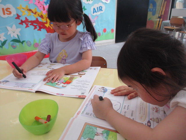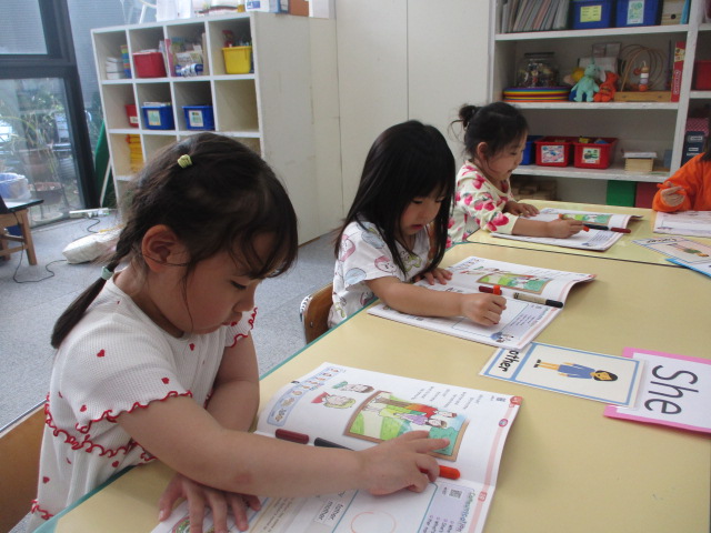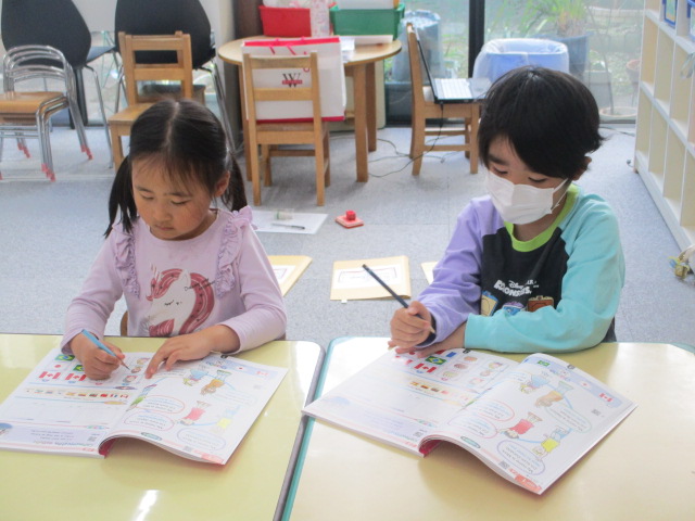 テキストのワークでは、お父さんやお母さんの顔を自分で描き、「Who’s she?」「Who’s he?」の質問に答えました。少し恥ずかしそうに「She is my mother.」「He is my father.」と答えるお友だちもいました。