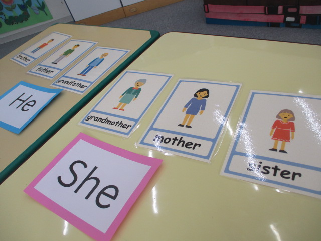 この日は、「family」がテーマでした。「father」「mother」「brother」「sister」「grandpa」「grandma」といった家族の単語を覚え、家族を紹介する表現を学習しました。