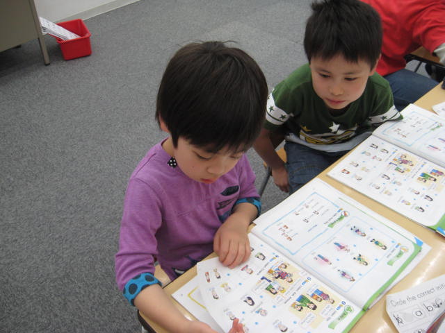 小学校高学年クラスは、お手伝いの表現を学習しました。make the bed、wipe the table、rake the leavesなどの表現をテキストで学習してから、ワークシートに取り組みました。CDから聞こえてくる「Do you wipe the table?」「Do you make your bed?」等といった質問を集中して聞き取ると、「Yes, I do.」「No, I don’t have a bed.」と自分の答えを正しく述べることができていました。