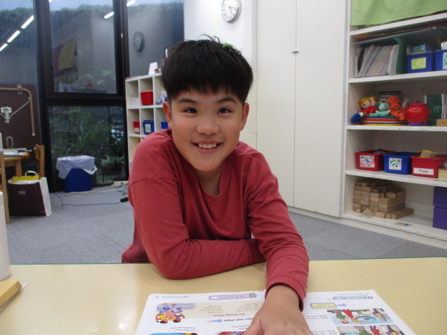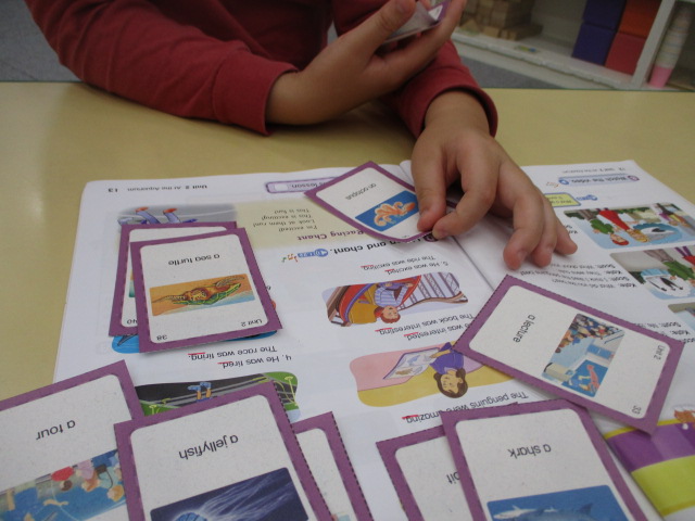 先生が提示するカードに合わせて「She always reads books.」「He usually practices Karate. 」のように英文を作りましたが、主語が「She」「He」となるので、動詞の最後に「S」をつけることを忘れないよう意識して取り組みました。