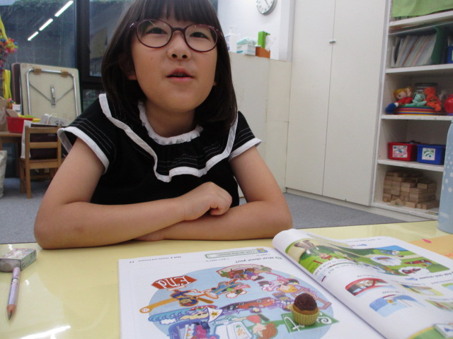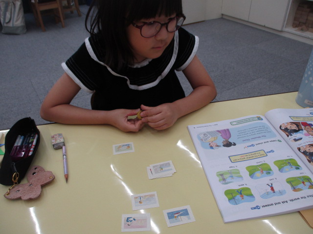 「What is he going to do?」「What does he need?」「What does she want to be?」「What does she want to do?」といった4つの質問に対して、絵カードの絵に沿って答えていきました。又、これらの構文を更に理解するためにワークシートに取り組みました。