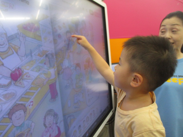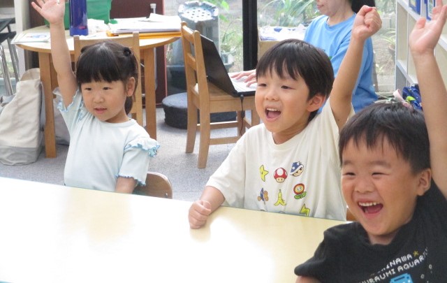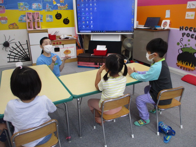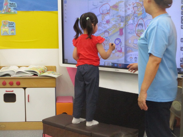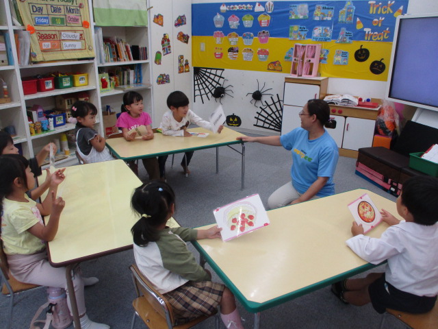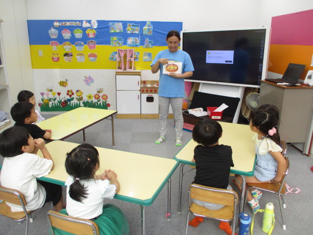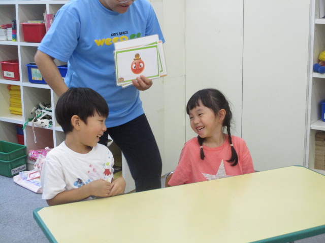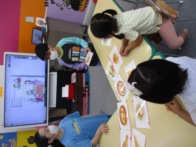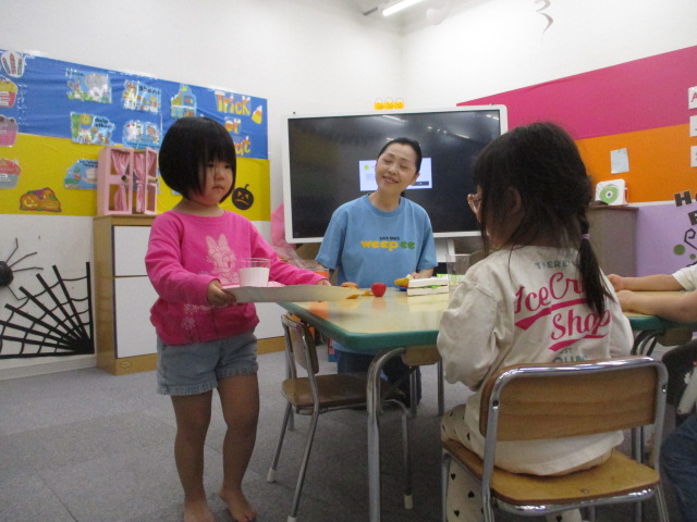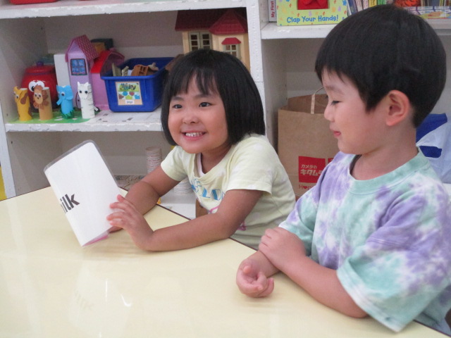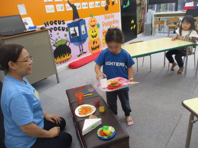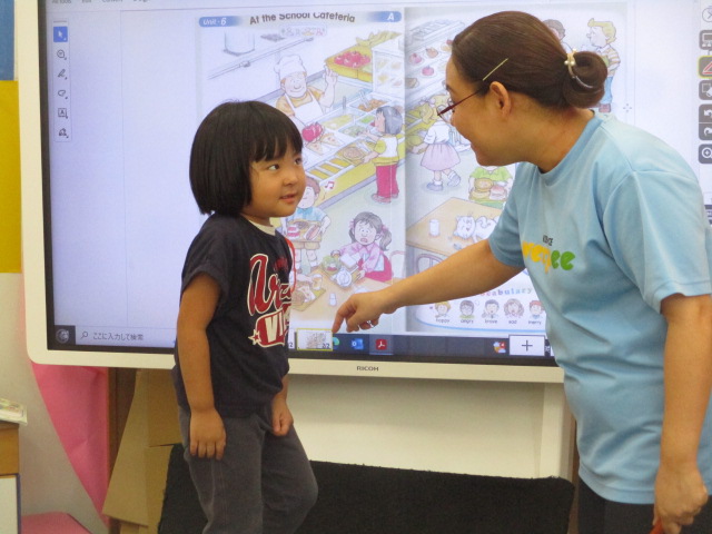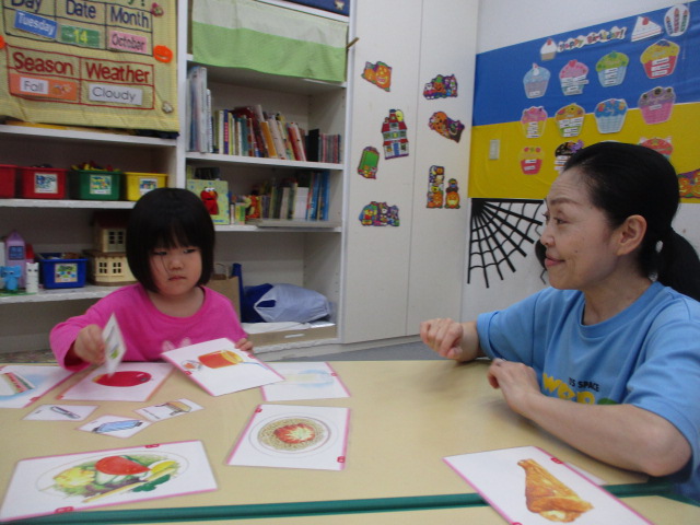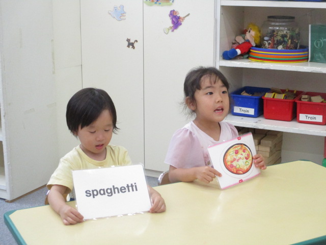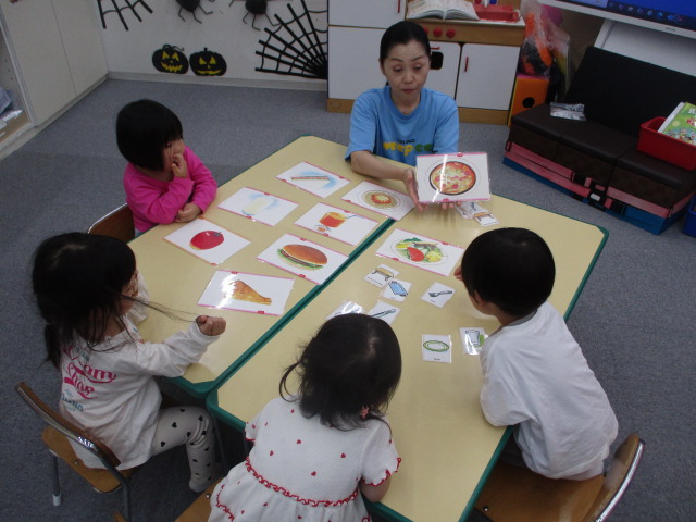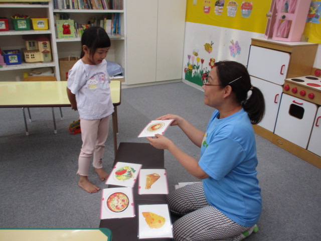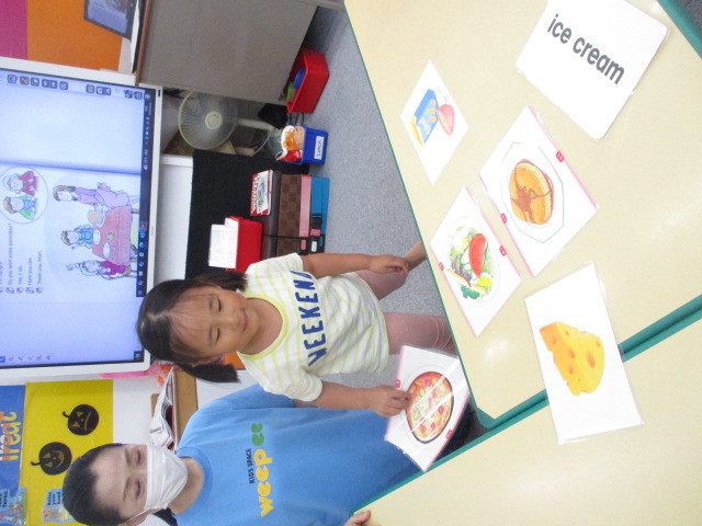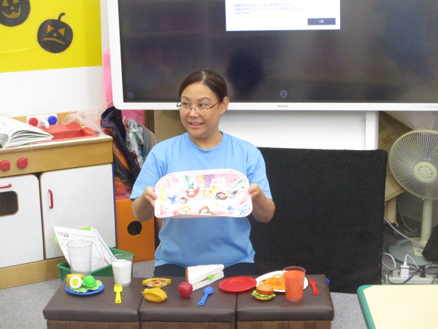 この日は、「食べ物」や「食器類」の単語を覚えて、自分が好きなものや食べたいものを伝えることに挑戦しました。