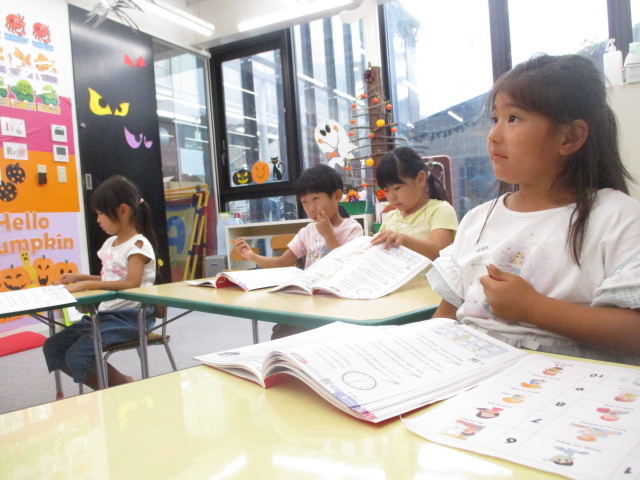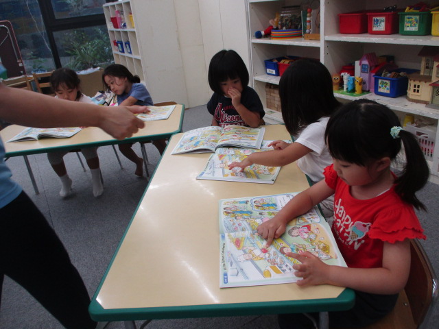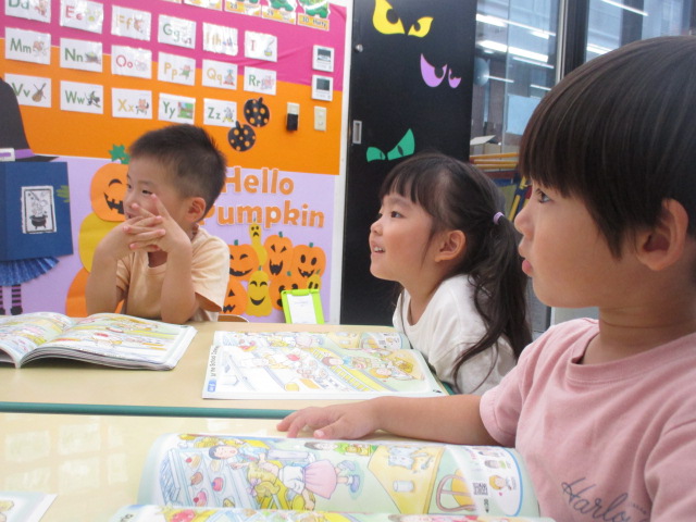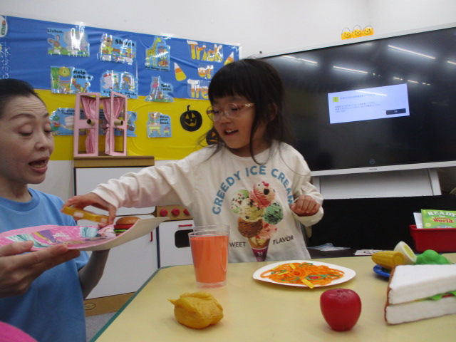 「hamburger」「spaghetti」「pizza」「salad」等々、みんながよく知っている食べ物がたくさん登場し、「What do you want?」という質問に「Hamburger, please!」「Pizza, please!」と答えました。