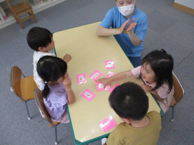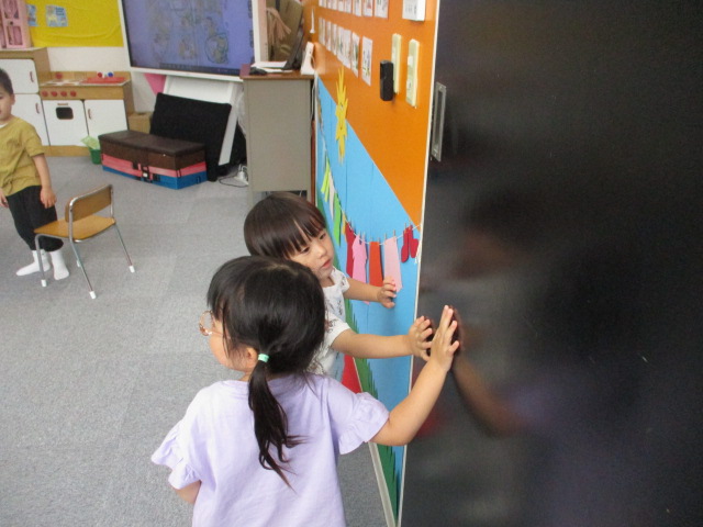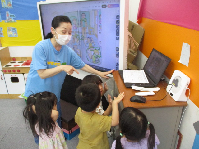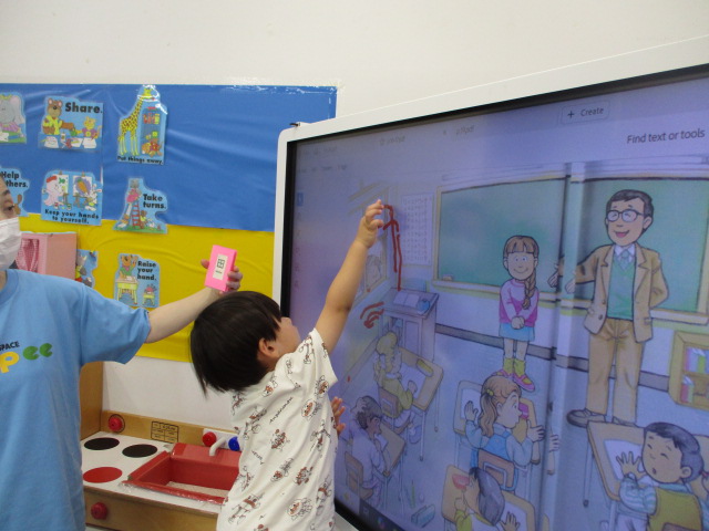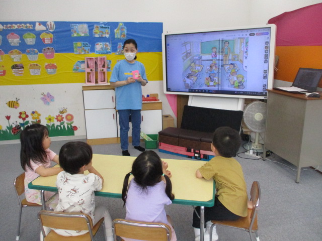 Grade 1 Class 「年少児 火曜日クラス」の様子をご紹介いたします この日は、「椅子」や「机」「ドア」といった教室の中にあるものの単語を学習しました。 テキストのイラストの中から、「chair」「desk」「door」「window」「light」「board」の他、「Who is wearing a skirt?」といった先生の質問を聞き既習のアイテムなども見つけていきました。 実際の教室の中でもアイテム探しを行い、テキストのイラストと同様に色々なアイテムを素早く見つけることができました。