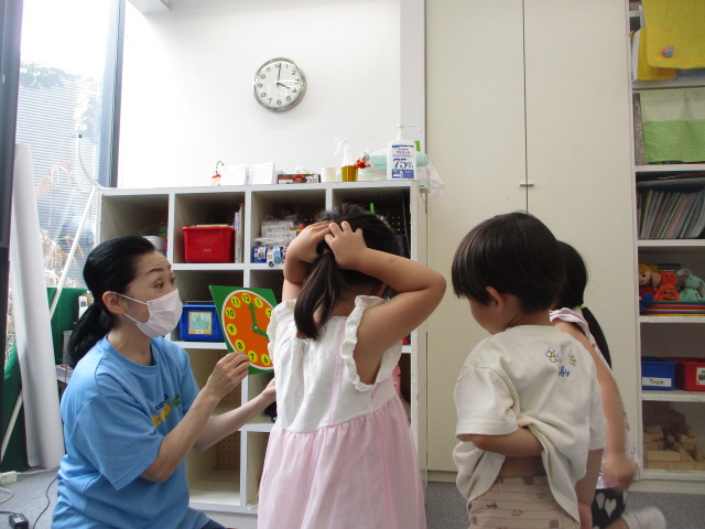 この日は、「時刻」を伝える表現から始まりました。テキストには、「It’s nine o’clock.」という表現が登場しますが、時計に書かれた数字をみんなで読み、短い針が指している数字が時刻を表す数字だということを覚えました。短い針を動かしながら「It’s four o’clock.」や「It’s one o’clock.」とみんなで練習しました。