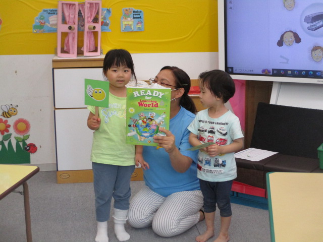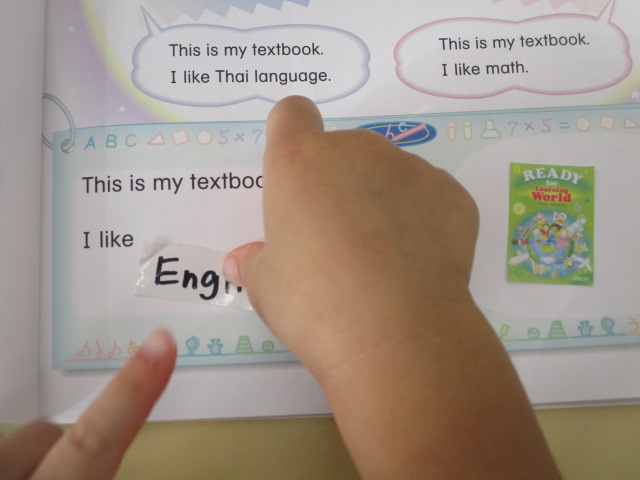 テキストのワークでは、テキストの表紙が描かれたシールや”English”と書かれたシールを貼り、「This is my textbook. I like English.」というフレーズを完成させました。
