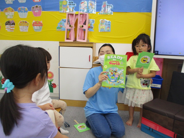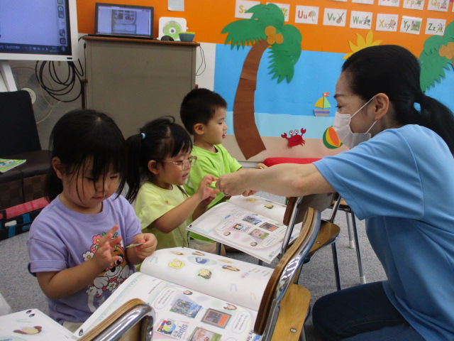 テキストには、「What’s this?」や「One more, please.」といったフレーズが登場し、それぞれに「Stapler!」などと文房具の名まえを言って応答しました。