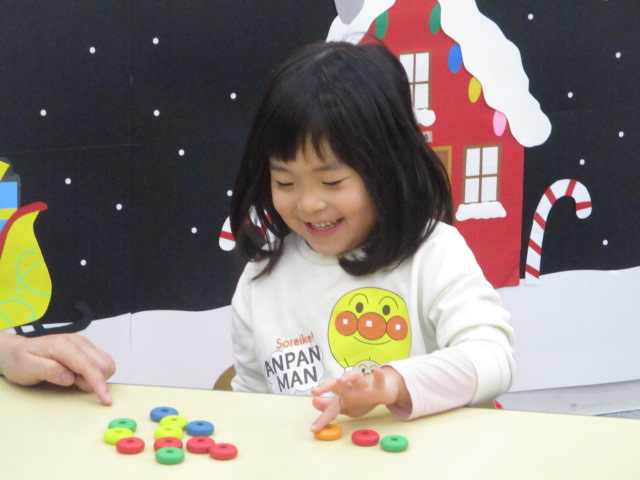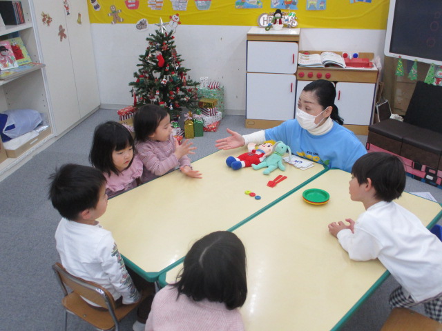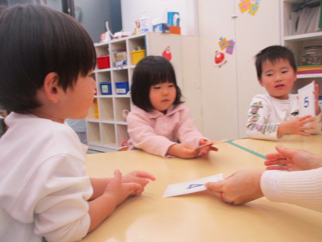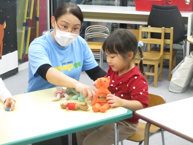 ブロックや人形、お皿、スプーン等々、様々なアイテムを使い「 I have three blocks.」「I have two spoons.」などと自分が持っているアイテムの「数」を伝えていきました。