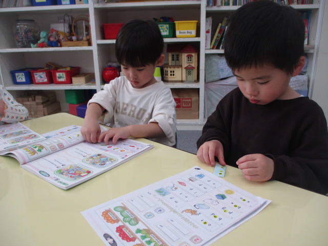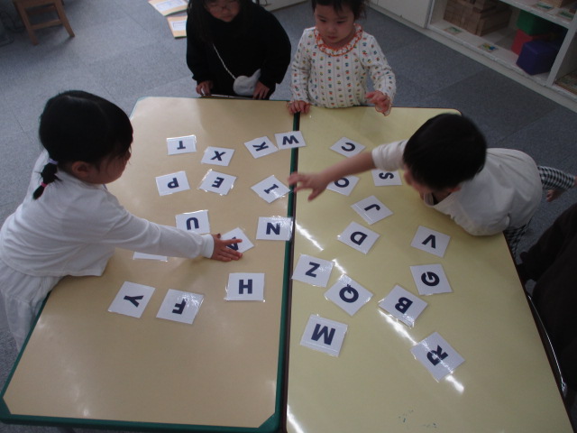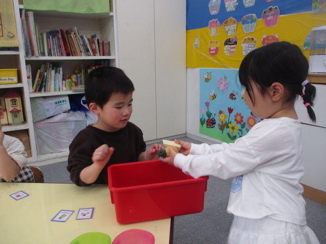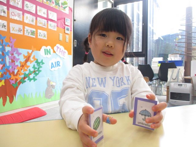 Grade 1 Class 「年少児 火曜日クラス」の様子をご紹介いたします 今年度最後のレッスンとなったこの日は、前回みんなで取り組んだ「お店屋さんごっこ」の復習から始まりました。商品アイテムの名まえを確認し、「I need cake and banana.」のように買いたいものを伝える時のフレーズを確認すると、より上手にお買いもができるようになったみんなでした。 又、今年度一年間取り組んできたアルファベットについても復習に取り組みました。カード取りゲームの要領で、正しい文字を素早く取ることを楽しんだみんなです。