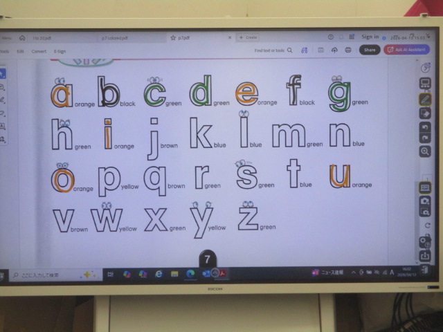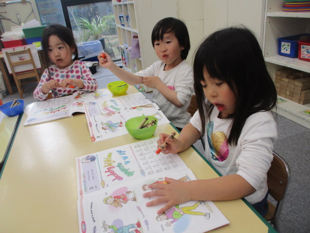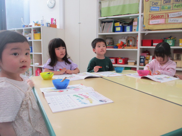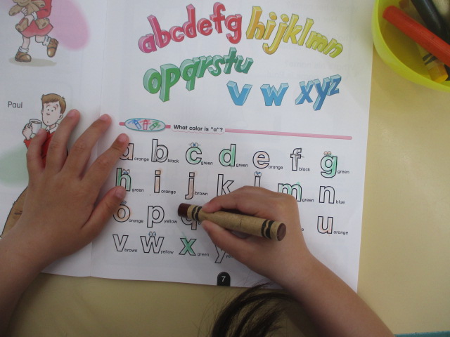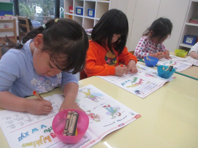 又、テキストのワークでは、小文字の学習に取り組み、「a」から「z」までの文字を指示された色のクレヨンで塗ることを楽しみました。