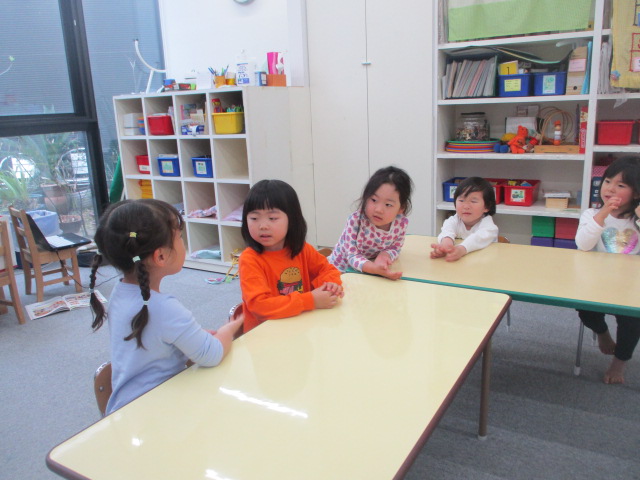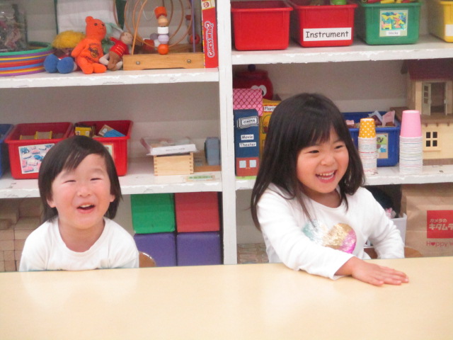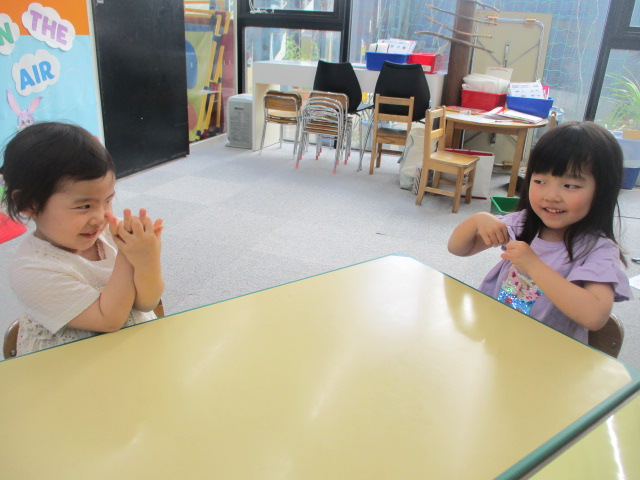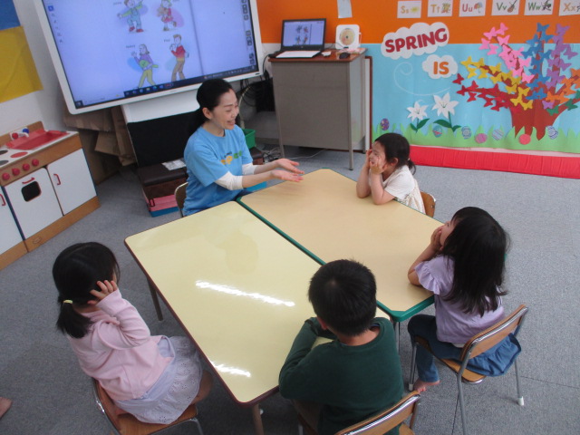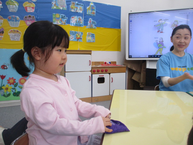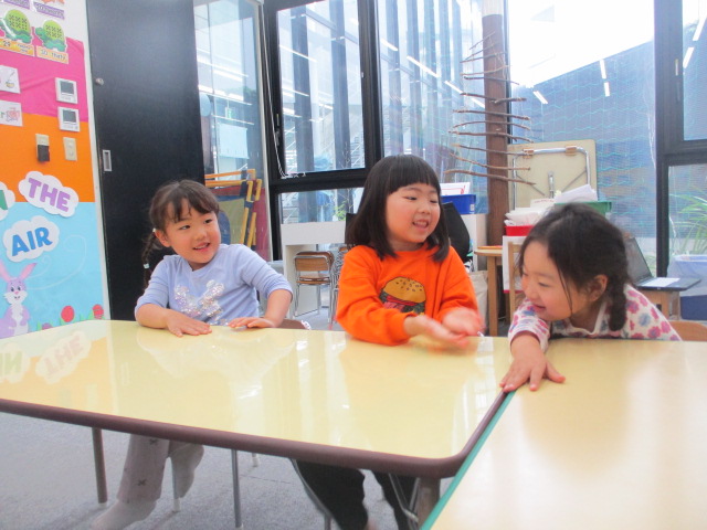 はじめのうちは慣れない様子の皆でしたが、お隣のお友だちとのやりとりを繰り返すと次第に慣れて「My name is ~. What’s your name?」とスムーズに行うことができるようになりました。