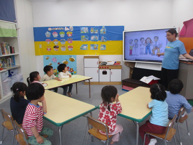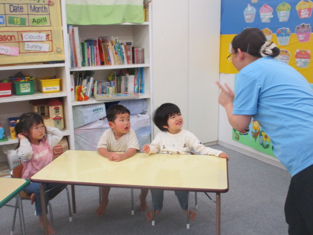 又、テキストに登場した会話は、名前や年齢をたずねたり答えたりするやりとりでした。「My name is ~.」や「I’m three.」という表現を練習し、「What’s your name?」「How old are you?」の質問に答えることに挑戦しました。