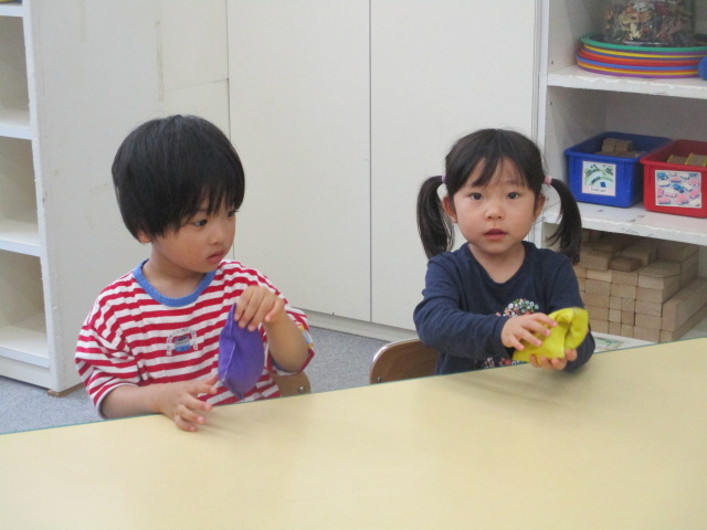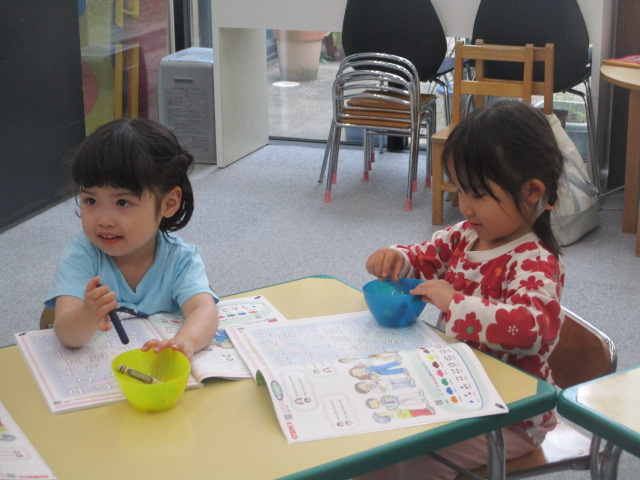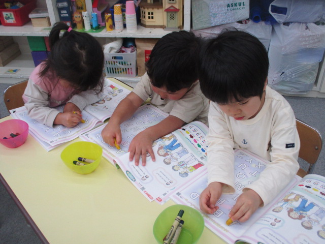 この日は、アルファベット大文字の学習に取り組みました。テキストに登場した大文字を指定された色のクレヨンでなぞり書きをしていきました。一文字ずつ一生懸命に取り組んだみんなです。