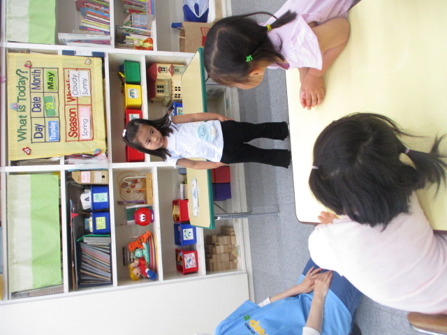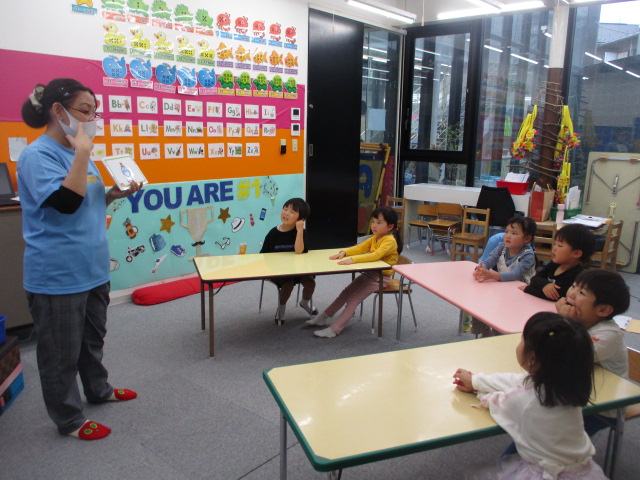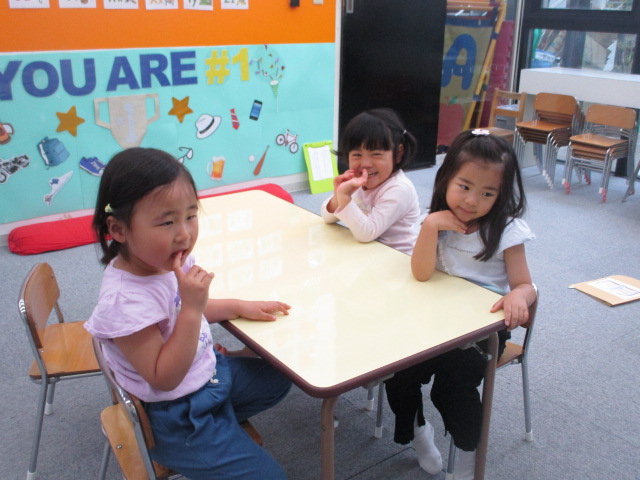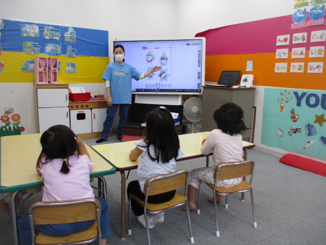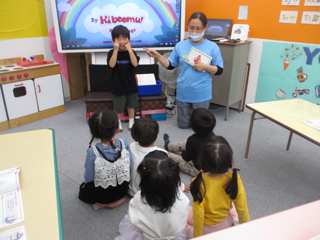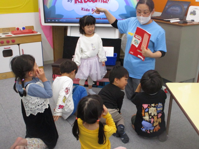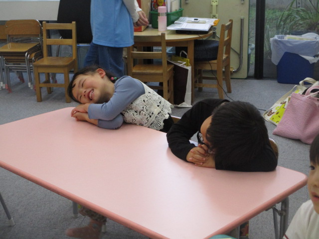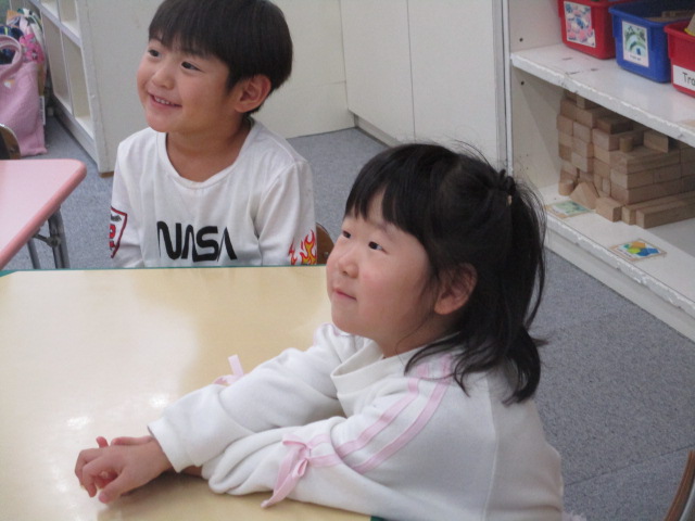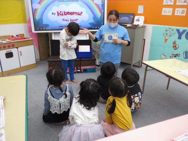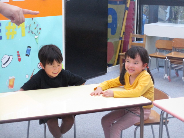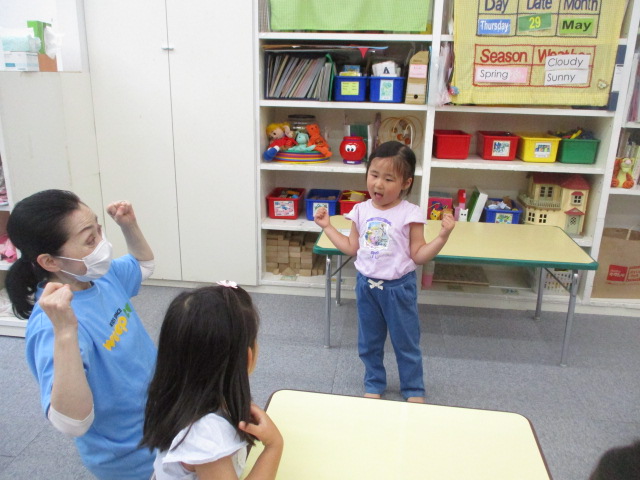 ジェスチャーゲームでは、お友だちの表情を見て「She is happy.」「She is sleepy.」などとお友だちの気持ちを表現することができました。