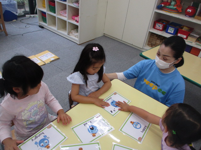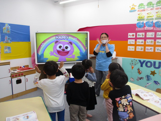 この日は、「feeling」がテーマでした。「happy」「sad」「angry」といった感情を表す単語を覚えて、自分の気持ちを伝える表現に取り組みました。