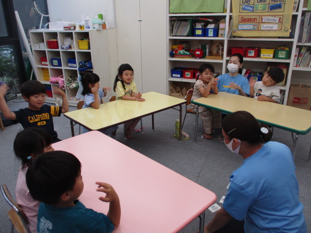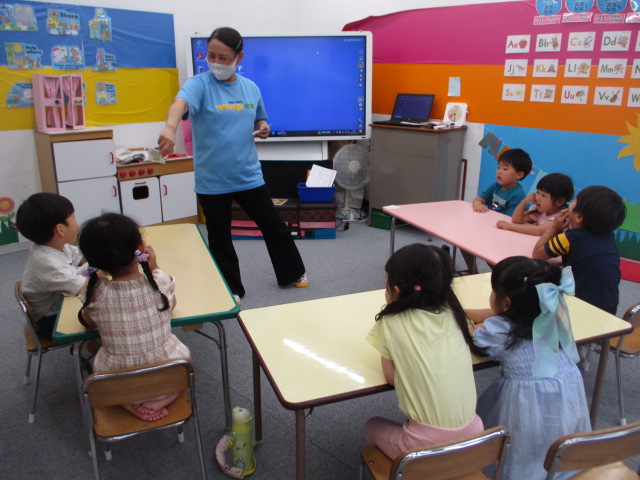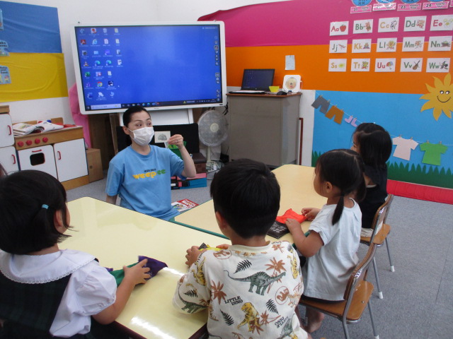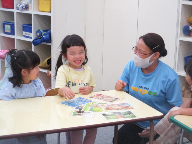 この日は「天気」がテーマでした。既によく知っている表現なので「How is the weather?」の質問には「It’s rainy.」や「It’s windy.」とスムーズに答えることができていました。