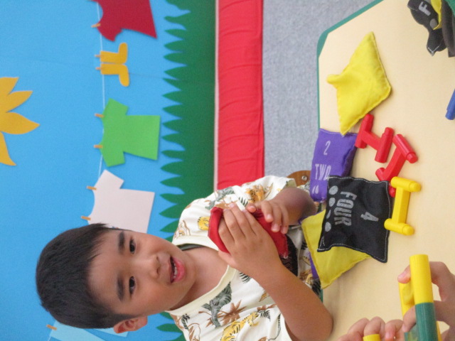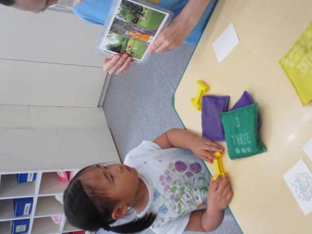 更に、「Let’s play soccer.」のように「~をしよう!」とお友だちを誘う表現に挑戦しました。「sunny」や「snowy」といったお天気に合わせてアクティビティを選び、「Let’s go swimming!」や「Let’s play cards!」と上手にお友だちに伝えることができていました。