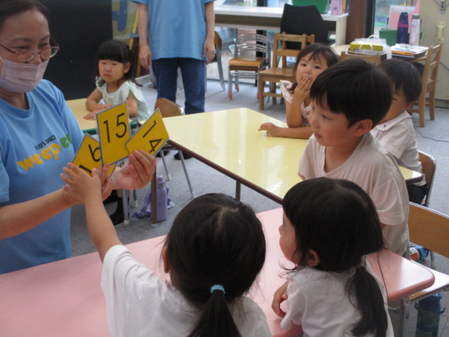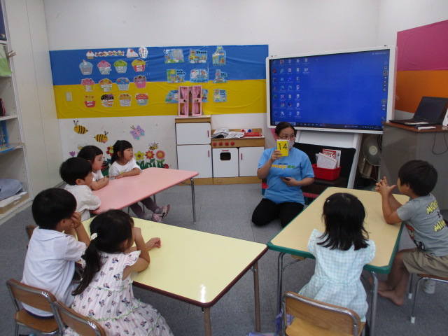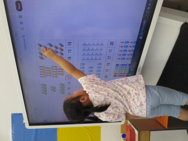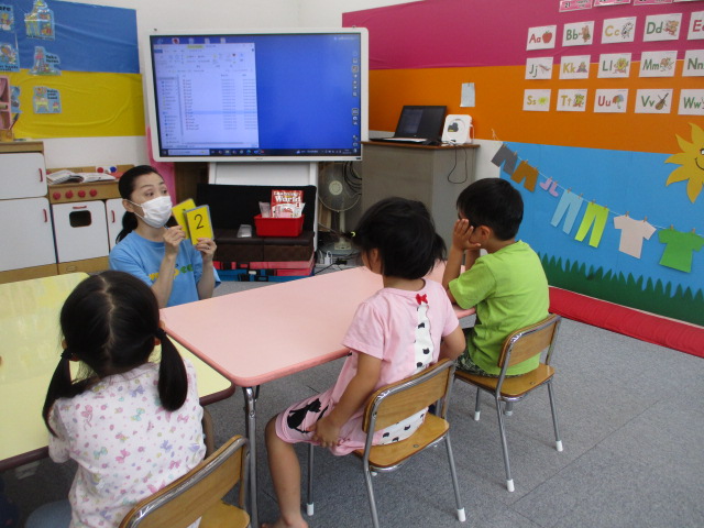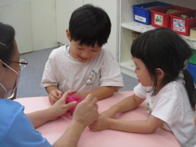 カップに入ったボタンをつかみ取り、その数を当てるアクティビティでは、「How many buttons do I have?」という質問の意味を理解し、先生の手の中にあるボタンの数を当てていきました。又、お友だちにも同じようにボタンをつかみ取って質問をしてもらいましたが、「How many buttons do I have?」と上手に言うことができました。