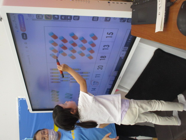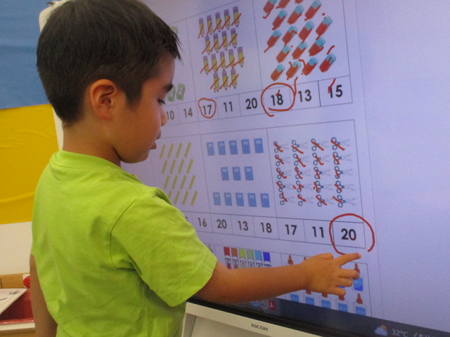 この日は、「How many ~」という表現を使い色々なものの数をたずねたり答えたりするやり取りに挑戦しました。