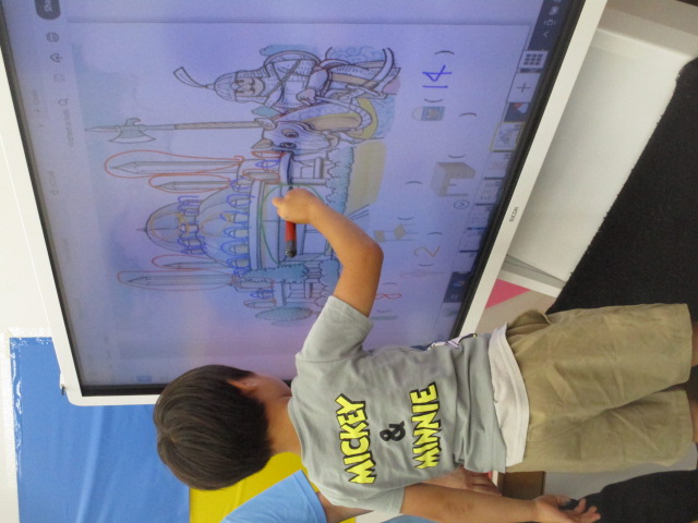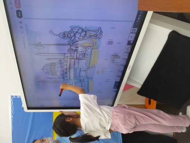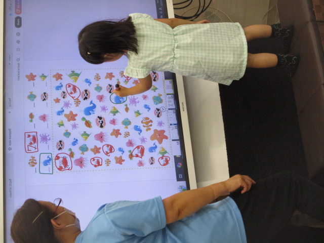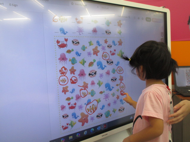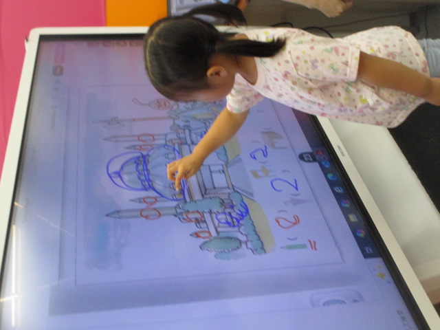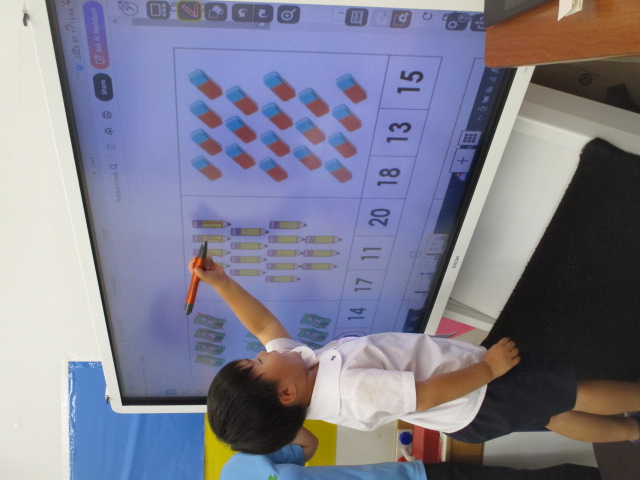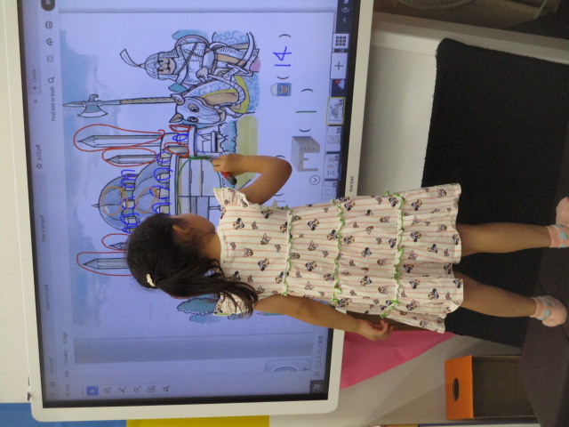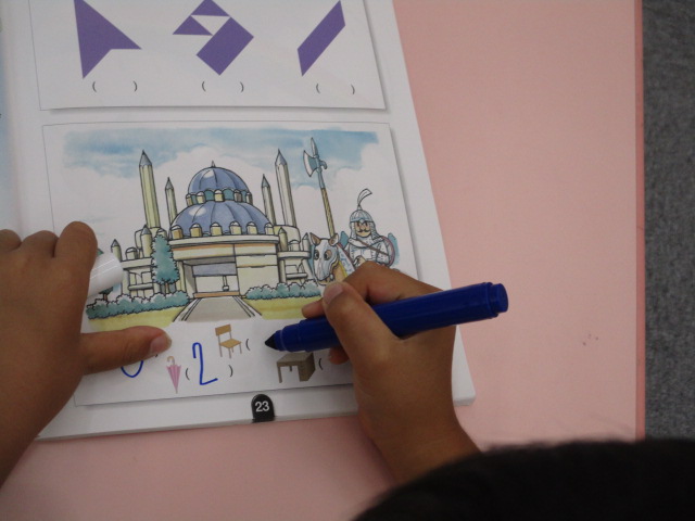 又、テキストの中のイラストを見ながら椅子や机、鉛筆などのアイテムを全て見つけ出し、「How many chairs do you have?」といった質問に答えていきました。