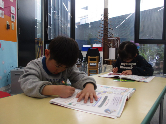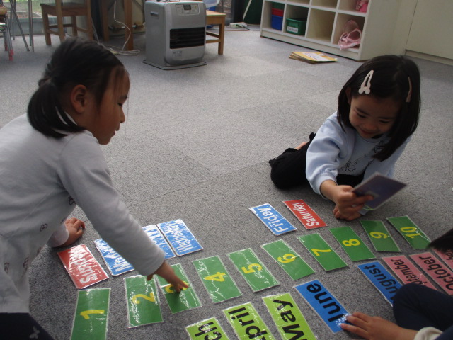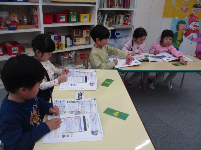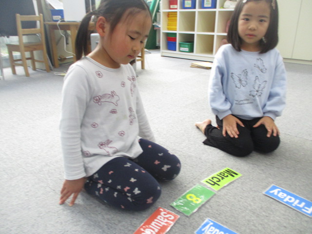 この日は、カレンダーの読み方から始まりました。毎回のレッスンで必ずカレンダーを確認するので、どのお友だちも自信を持って取り組んでいました。