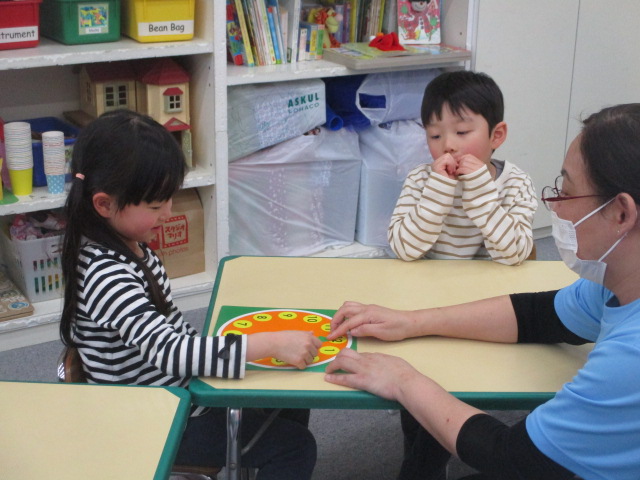 更に、「go to school」「go home」「take a bath」といったアクションが描かれたカードと時刻を表す時計を使い、家に帰る時間やお風呂に入る時間を「At four o’clock.」や「At seven o’clock.」と伝えることができました。