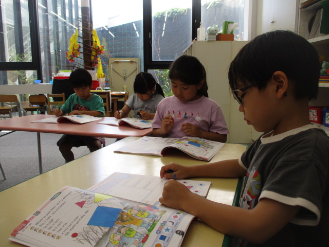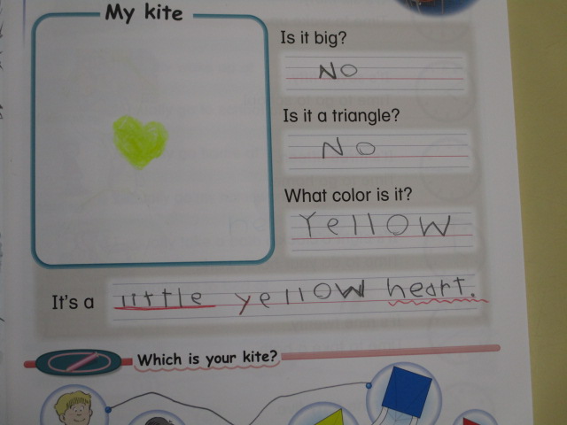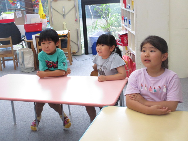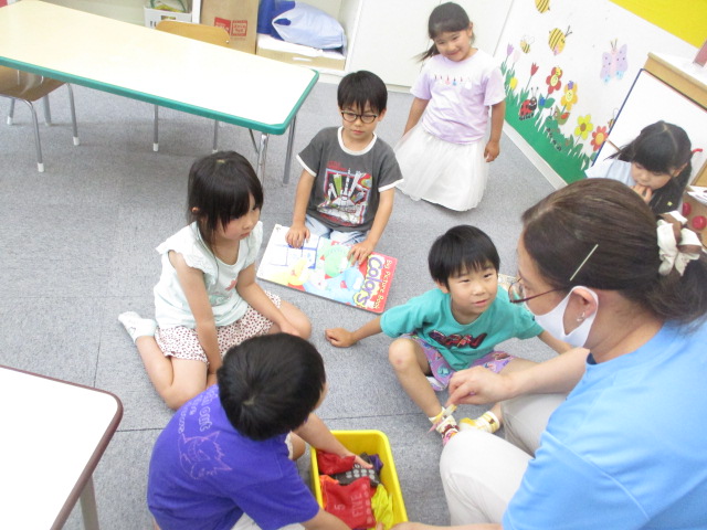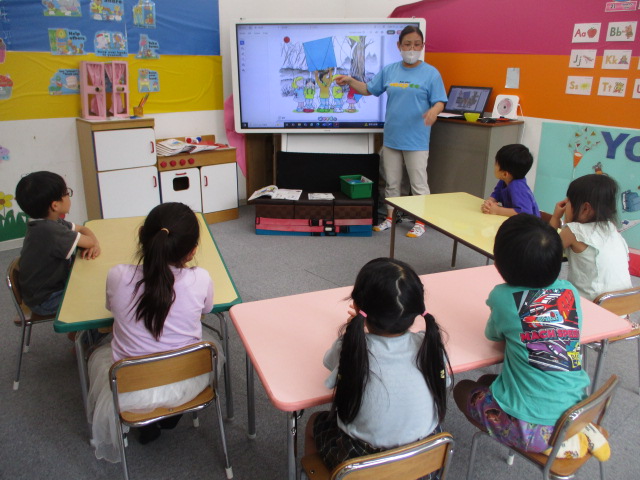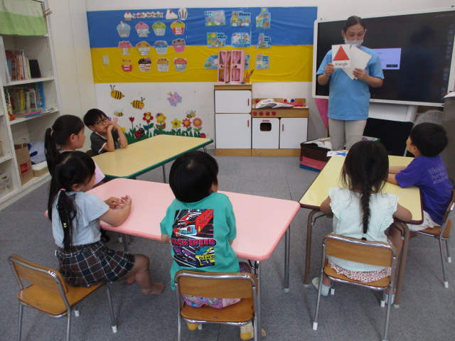 この日は、「色」「形」「大きさ」がテーマでした。テキストには色々な凧が登場し、それぞれの持ち主を探していきました。「Is it a triangle?」「Is it big?」「Is it red?」といった質問への答えを聞きながら、「It’s a little red triangle kite.」ということがわかりました。