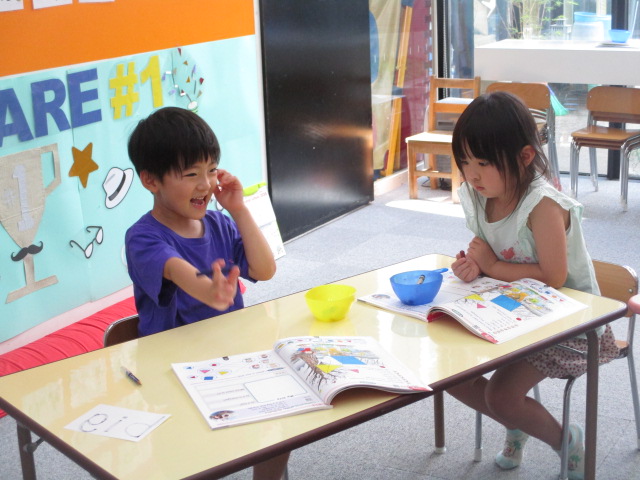 テキストのワークでは、みんながそれぞれに3つの質問に答えながら自分自身の凧を描いていきました。最後は、「It’s a big blue star!」と自分の凧を紹介してくれました。