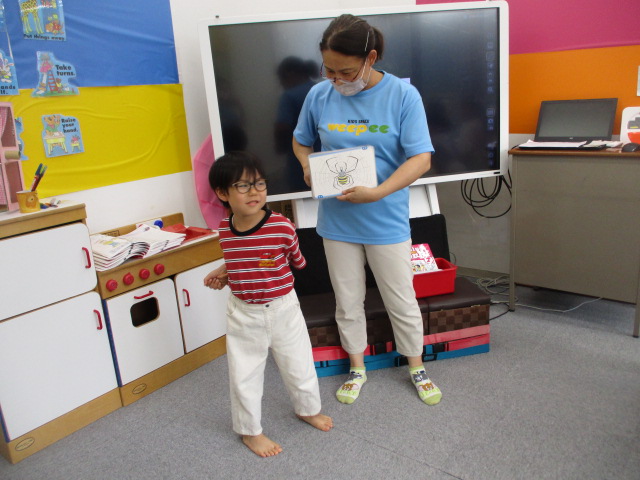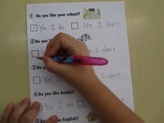 「Yes, I do.」「No, I don’t.」の返答だけではなく、お友だちに「Do you like English?」等と質問をすることもしっかりできました。