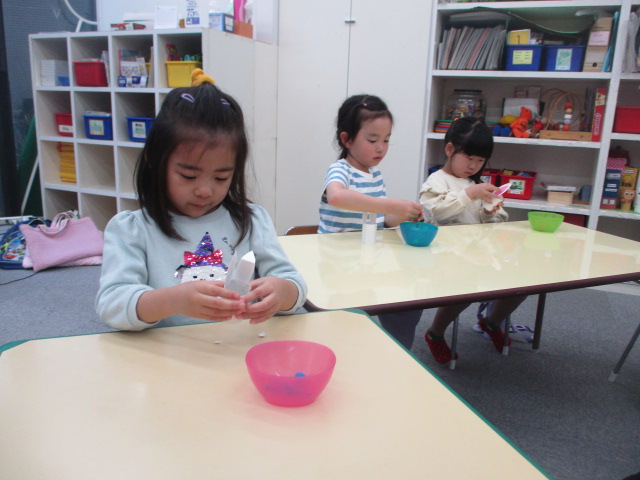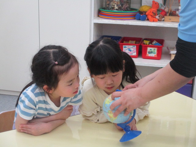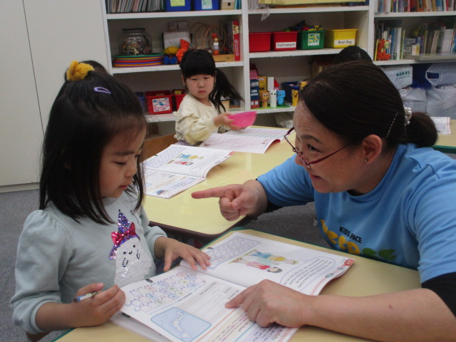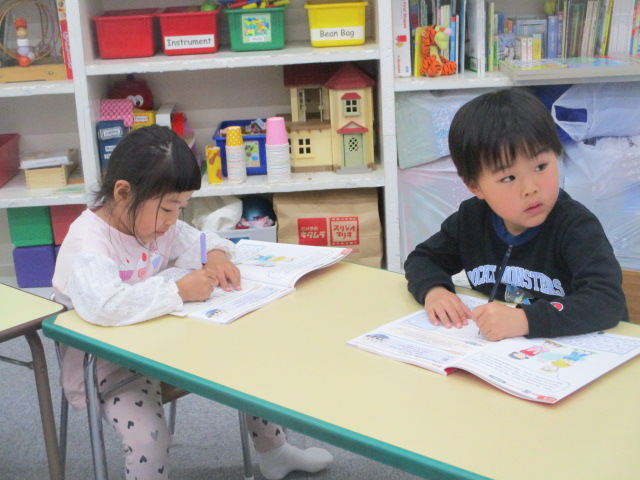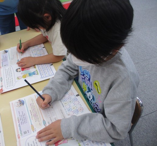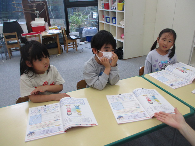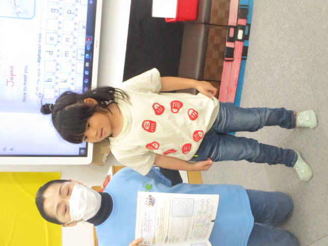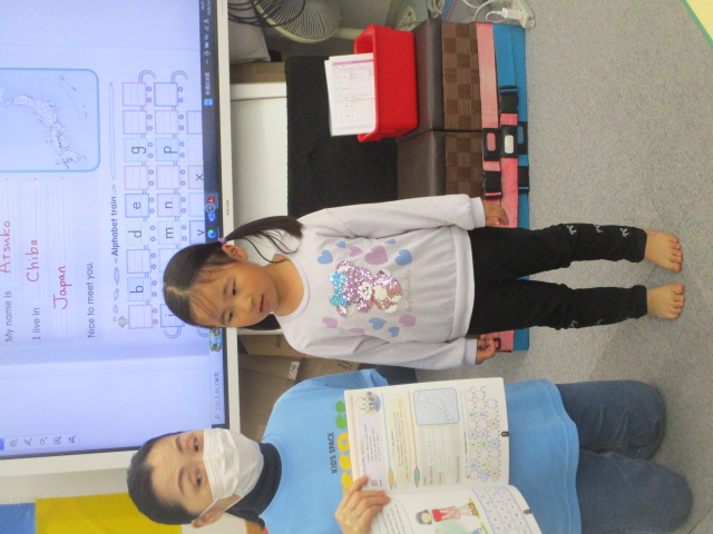 Grade 3 Class 「年長児 木曜日・金曜日クラス」の様子をご紹介いたします 年長児クラスに進級して最初のレッスンは、「自己紹介」に挑戦しました。テキストには、自分の名まえや年齢の他、住んでいる場所などを伝えるスピーチが登場しました。 繰り返し練習をし、自分の名前や年齢、そして「I live in Chiba, Japan.」と住んでいる場所もしっかりと伝えることができるようになりました。