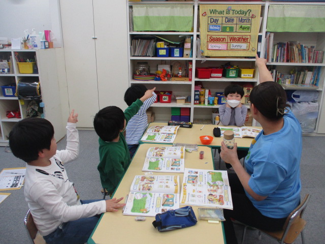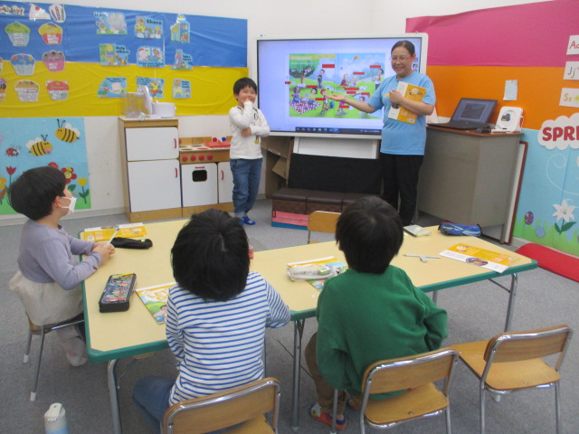 この日の「小学生クラス」は、「this」と「that」がテーマでした。「時計」「クリップ」「教科書」「カレンダー」「鉛筆削り」等々、教室の中や身の回りにあるものの単語を覚え、「What’s this?」「What’s that?」の質問に答えることに取り組みました。
