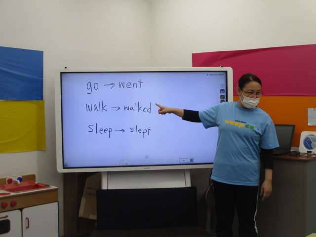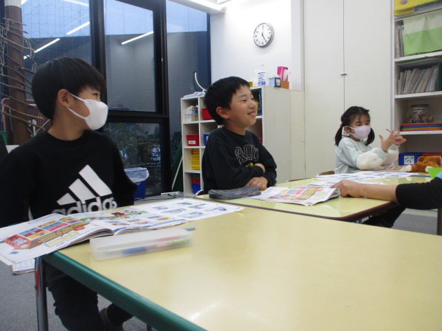 この日の「小学生クラス」では、過去形がテーマでした。「What did you do yesterday?」の質問に、「I did homework.」や「I played a video game.」のようにテキストに登場するフレーズを使って答えたり、自分自身が実際に昨日したことを答えたりしました。