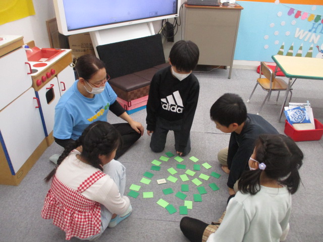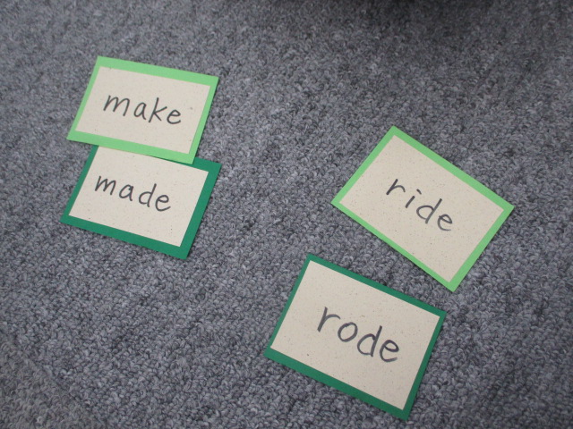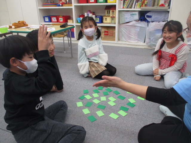アクティビティでは、現在形と過去形をマッチングしていくカードゲームに取り組みました。「is」と「was」、「study」と「studied」のように動詞の現在形と過去形を合わせるように神経衰弱ゲームの要領でペアになったカードを取っていきました。